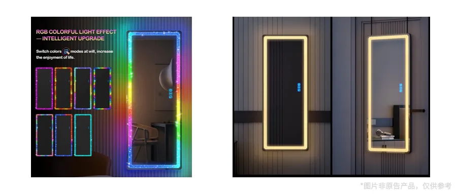 原告是一家美国公司,此案涉及的是一款全身发光镜,这款全身镜的特征可以是边框的前表面上的多个晶体、布置在多个晶体内的多个LED,并能通过遥控器改变颜色,并且照明设置/模式可以包括频闪、恒定、图案化等。此专利技术不仅具有美观的装饰性,还提供了多样化的光效体验,成为市场上独具特色的产品。