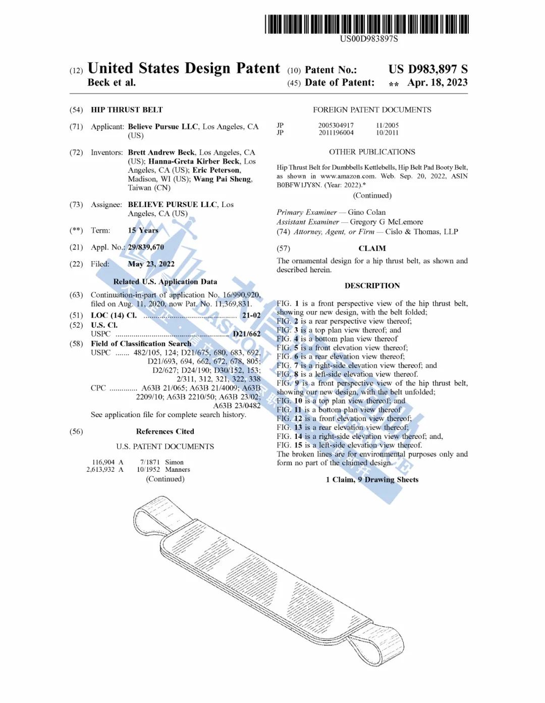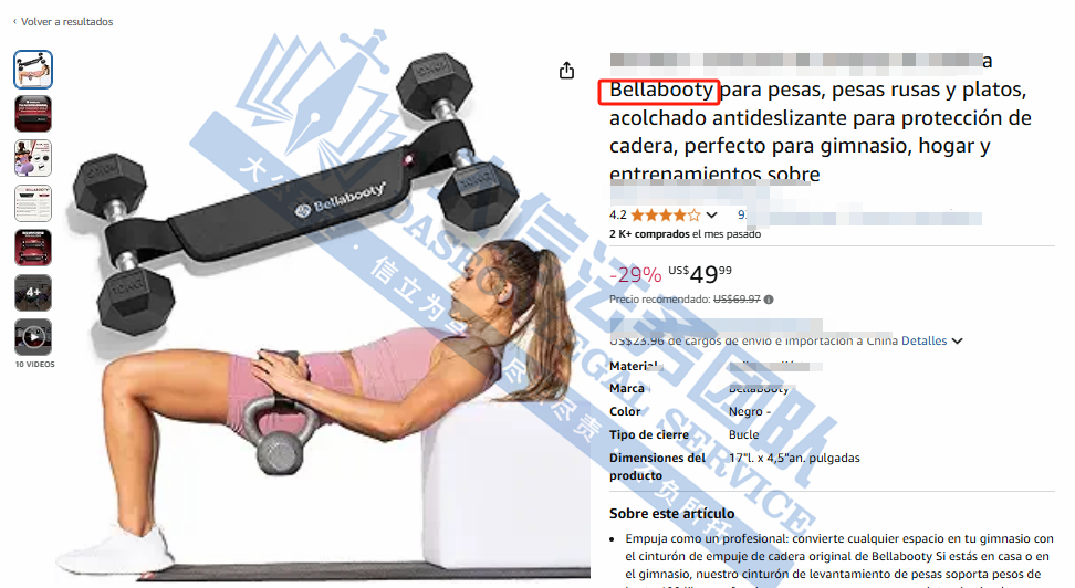 此案为商标+专利双重维权,涉及商标词:BELLABOOTY,注册大类为第28大类健身器材;外观专利号为:D983897。跨境卖家一定要尽快尽快检索下架,避免TRO冻结风险!