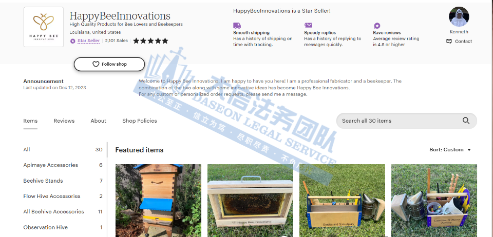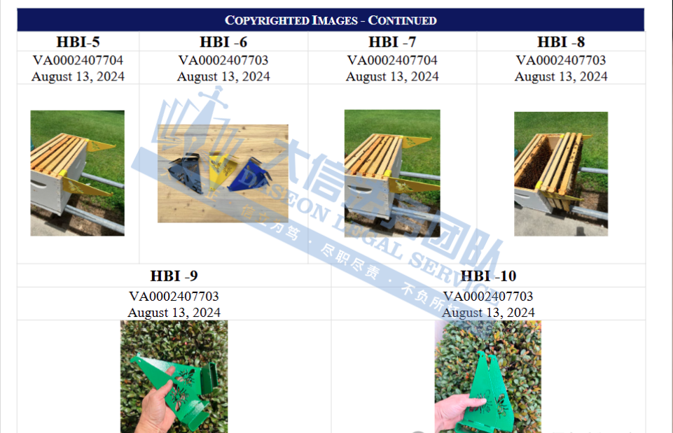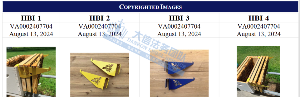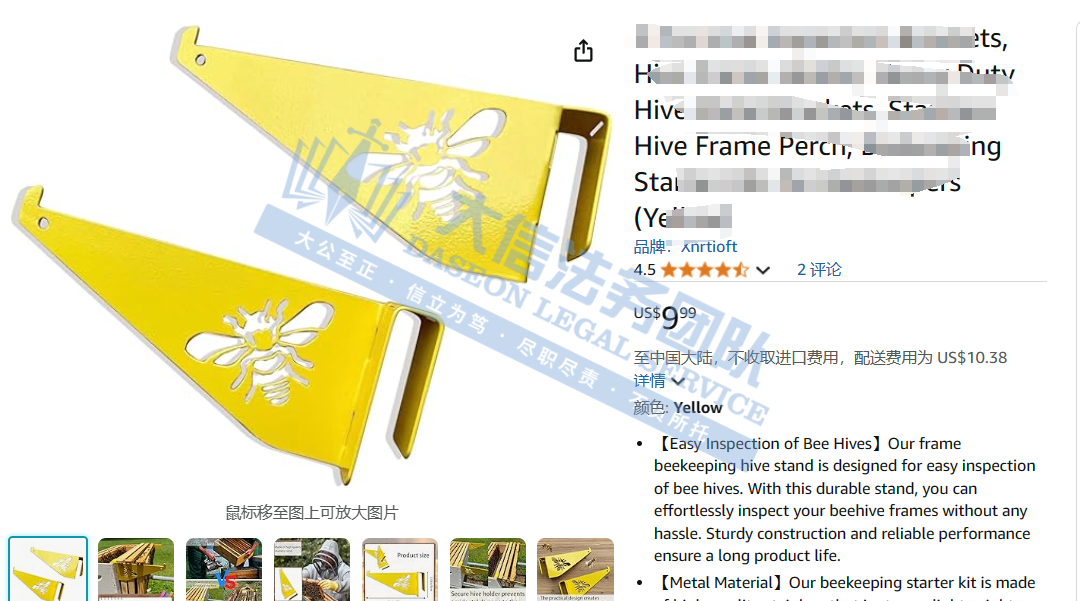 此案为匿名版权维权案件,目前涉了共40个店铺,维权产品为KTM Enterprises热销产品:Happy Bee蜂箱检查支架,跨境卖家尽快检索下架,避免造成TRO侵权损失!