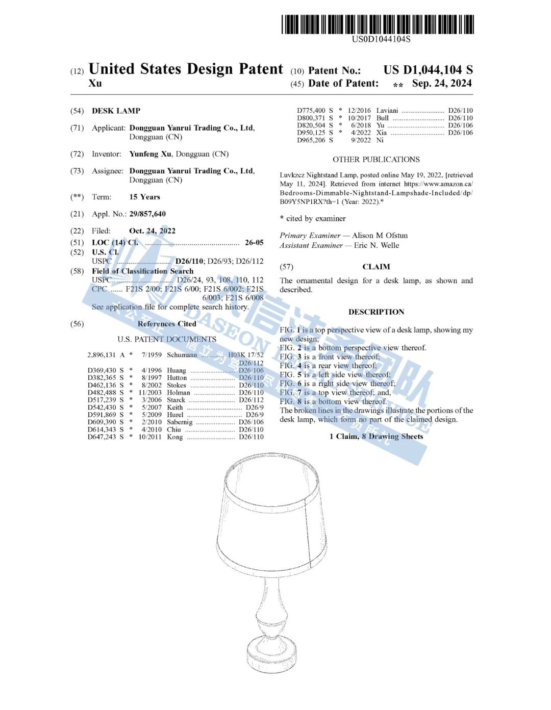 此案为专利维权,涉及2项外观专利,专利号:US D1044104 S、US D1050544 S;未经授权不得擅自使用,相关跨境卖家尽快对照下架,避免造成侵权损失!