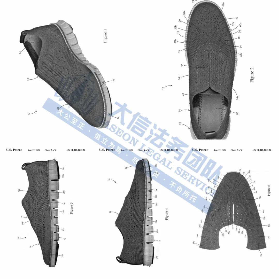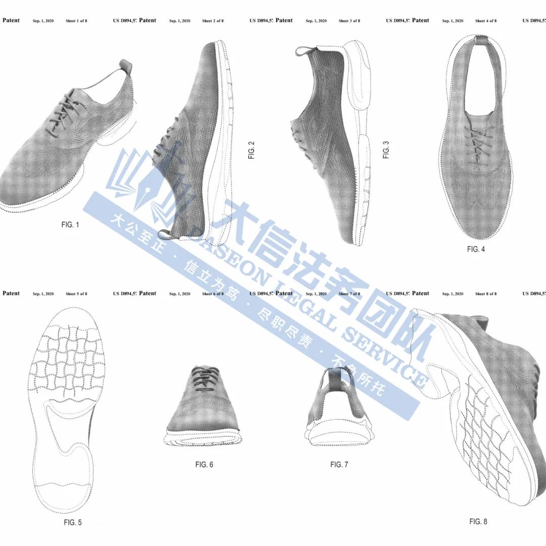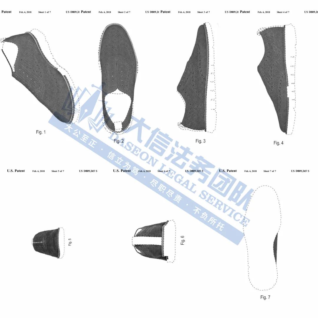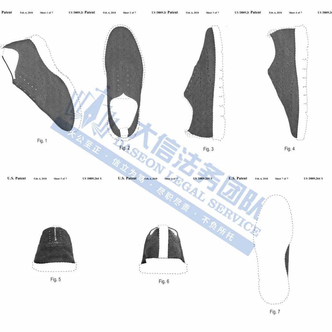 此案为专利维权,维权涉及的专利多达8项,涵盖鞋子的外观、鞋底、鞋边连接位等多个部分。专利号分别为:10327511 、10443163、11041262 、D809264 、D809265、D816308、D894575 、D903267 等,跨境卖家对比下架,避免造成TRO侵权损失!