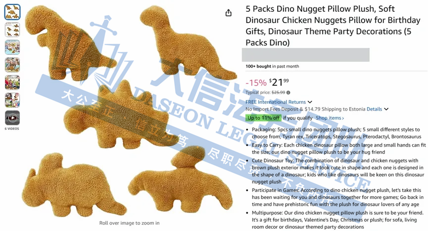 原告是国人卖家,根据恐龙的骨骼结构和外观特征进行设计,研发了多款深受各年龄段人群喜爱的恐龙毛绒玩具,采用高品质 PP 棉,触感柔软舒适,对于儿童和成年人来说,都是家居装饰的首位选择!