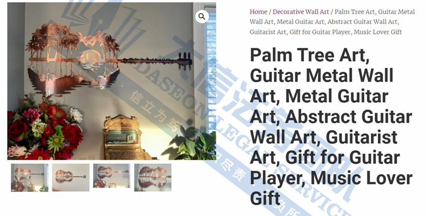 此案为一起匿名版权维权,目前已冻结62家店铺,共涉及包含39张吉他金属墙艺术图片,以下列出部分可供卖家参考,未经授权官网的图片均不可擅自使用,否则会与TRO冻结风险!