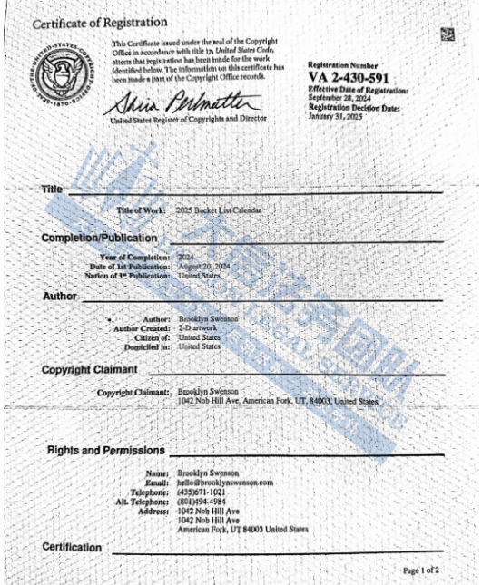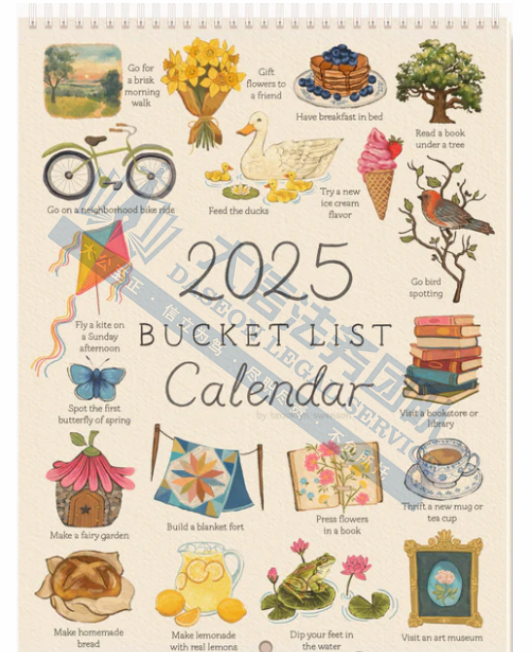 此案为版权维权,24年8月创作的一副关于25年的愿望清单,并于2025年1月31日下证,版权号为:VA 2-430-591,版权图片还未公开,以下是相关图片,卖家可以参考,除此之外,未经授权官网的图片均不可擅自使用,否则会有TRO冻结风险!