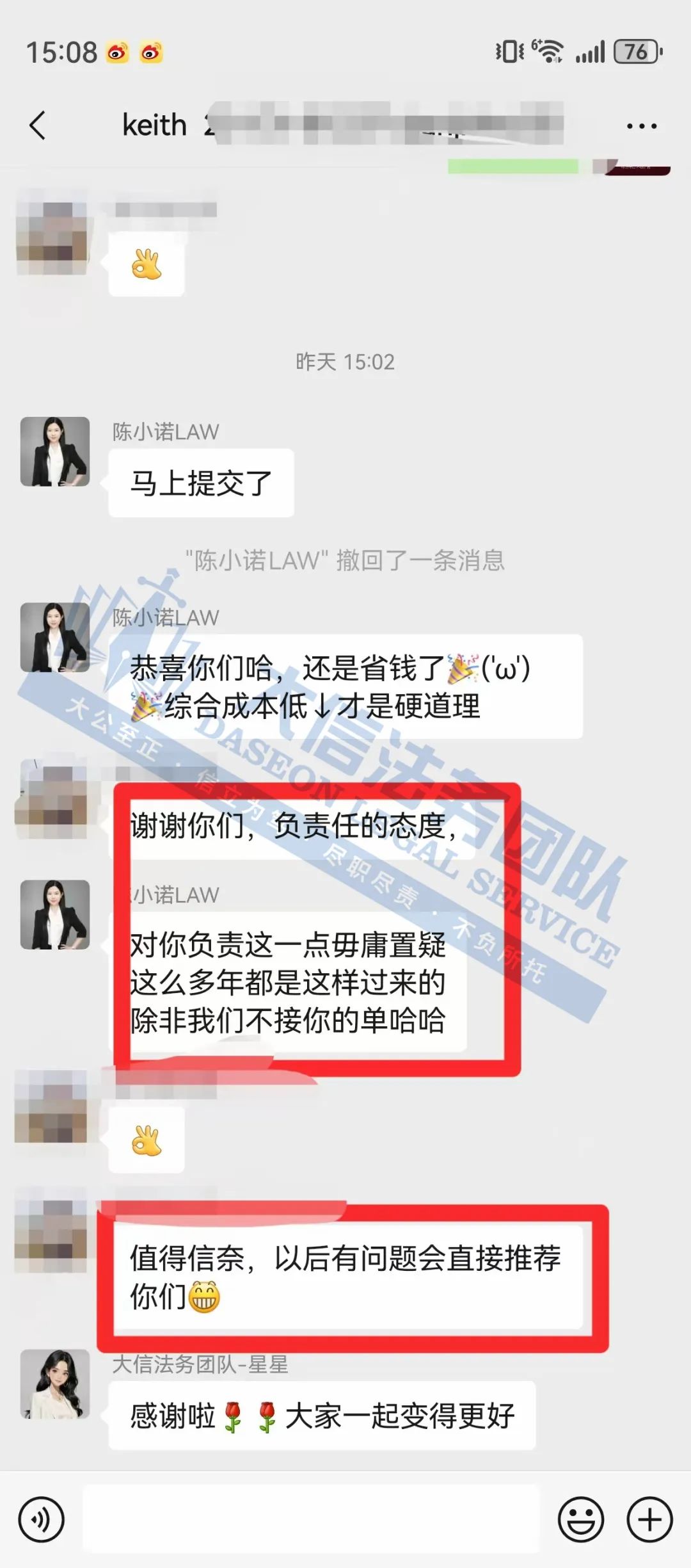 同样,在接受委托之后,我们立即介入案件进行分析处理,在我们团队律师的不懈努力下,不足一周,终于完美解决