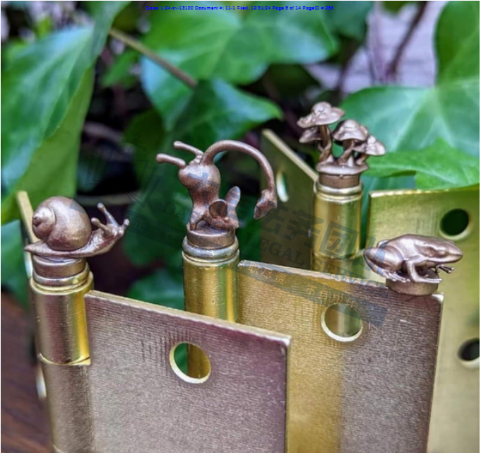 04 动物铰链头版权 案件号:25-cv-01884 立案时间:2025年2月24日 原告:Tiny Biotics LLC 代理律所:Sriplaw 原告介绍 原告是一家位于美国亚利桑那州的企业,专注于打造自然灵感与复古魅力相融合的小饰品与酊剂,金属铰链头是该公司推出的特色产品,由Hollie Liles亲自设计。这些小巧而富有创意的装饰品覆以青铜色,赋予其复古风情。凭借其微小的磁性底座,无需工具即可轻松安装于家中任何金属表面,如门铰链、橱柜等。受到了广泛的欢迎!
