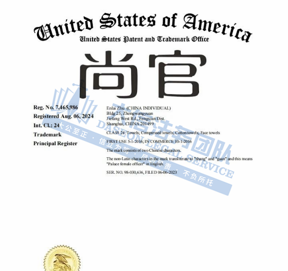 案件分析 此案为商标维权,涉及原告信息还未公开,但查询到旗下仅持有“尚官”一个商标,且该商标注册于第24大类,涵盖毛巾、压缩毛巾等相关产品,于2024年8月6日下证,以下是该商标信息,跨境卖家尽快检索下架!避免造成TRO侵权损失! 产品展示
