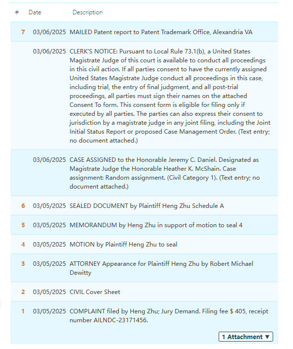 案件分析 此案为专利维权,专利号为:D1020133,原告曾在24年10月曾发起维权【24-cv-01809】,今年1月也发起维权,但因材料不足被驳回诉讼,时隔1月,再次维权。跨镜卖家尽快检索下架,避免造成侵权损失! 案情进展