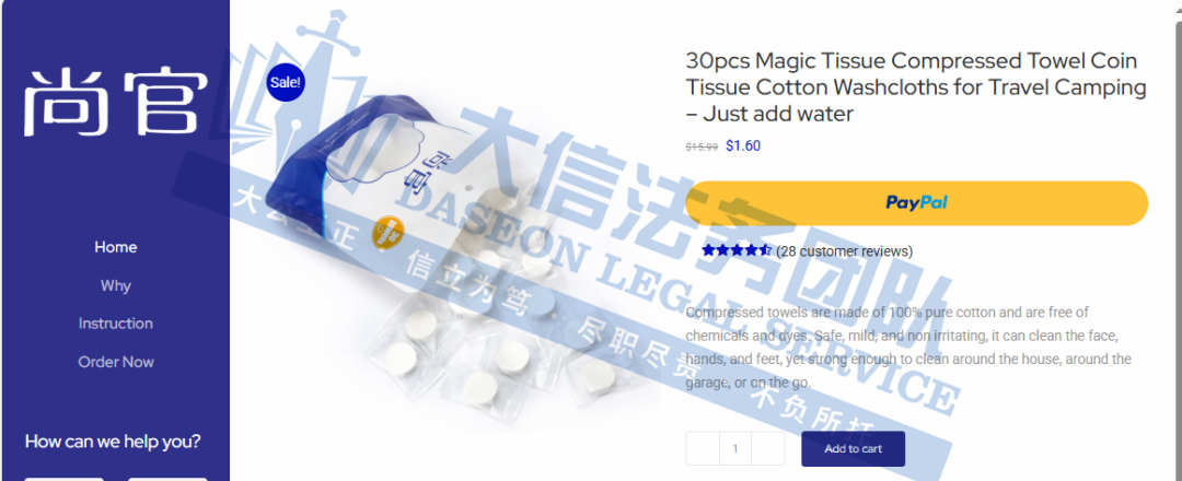 大信团队在原告发起缺席动议之前,首次委托特级律师处理案件的,在缺席动议之前没有达成和解的,大信团队可以免费做缺席延期!! 同时,我们大信团队可进行清空返款服务 从案件评估、策略制定,到和解谈判、法律诉讼,我们全程陪伴,助您顺利解冻账户资金,并争取最大利益返还! 01 “尚官”商标 案件号:25-cv-21032 立案时间:2025年3月6日 原告:Enlai Zhu 代理律所:Palmer 受理法院:佛罗里达南区地方法院 原告介绍 原告是尚官品牌美国商标的持有者,尚官品牌,英文名SingleLady,2010年起源于上海,专注于户外用品及旅行配件领域。尚官牌压缩毛巾是一款创新旅行配件,以其卓越的品质和便捷的设计,成为户外旅行和日常生活中的必备良品。这款压缩毛巾采用100%纯棉材质,不含任何化学品和染料,确保使用过程中的安全性和温和性,适合所有肤质,尤其对敏感肌肤友好。