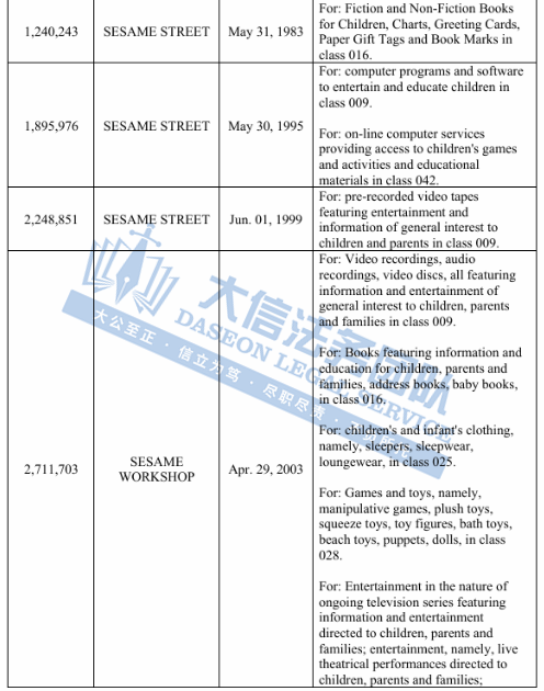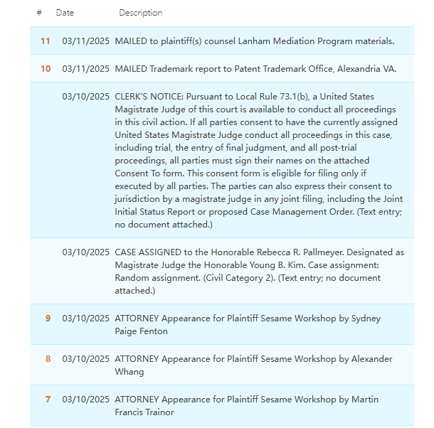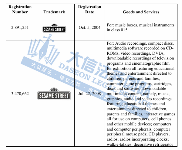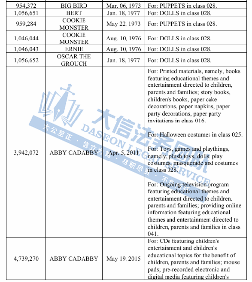 此案为版权+商标维权,原告旗下注册众多个商标,维权关键词:Sesame Street、Big Bird、BERT、COOKIE MONSTER、OSCAR THE GROUCH 等;值得注意,2025年以来芝麻街已经连发七案,侵权风险极高,跨境卖家尽快检索下加,否则会有TRO冻结风险!