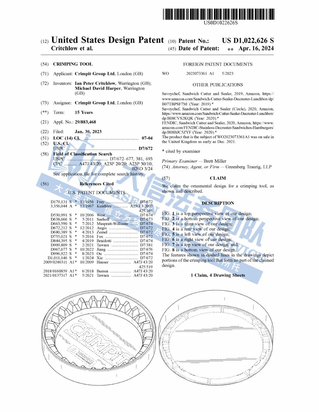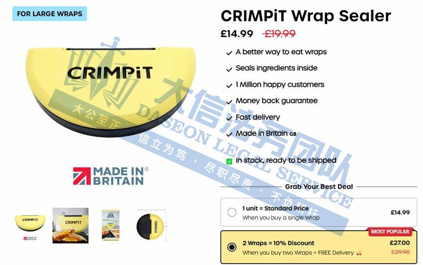 原告是一家专注于厨房工具设计与制造的企业,致力于通过创新设计,提高食品制作的便捷性和效率,让人们在享受美食制作过程的同时,也能获得更健康、更有趣的饮食体验。此次涉及的明星产品是一款食物封口机,专为制作如墨西哥卷饼、馅饼等美食而设计,通过简单的按压操作,即可轻松实现完美的卷边效果。自2021年底推出后,Crimpit食物封口机迅速在全球走红,成为厨房中的必备之物。