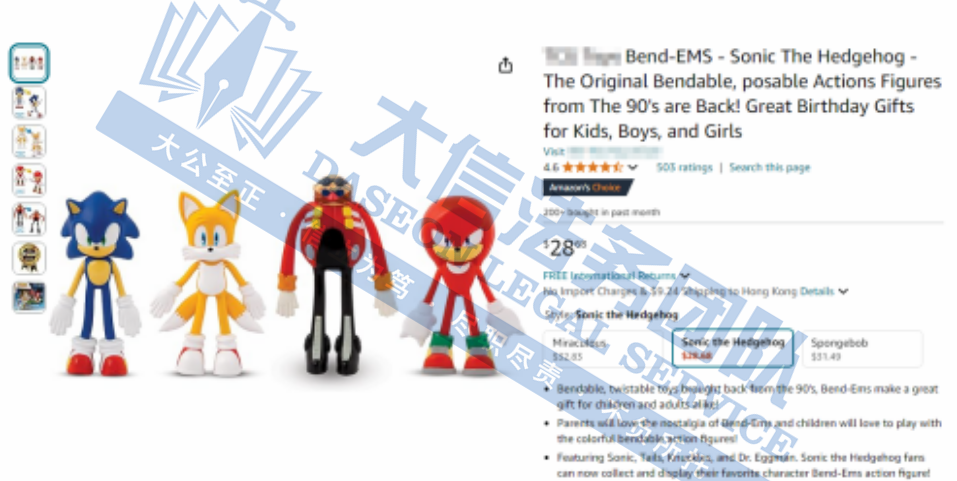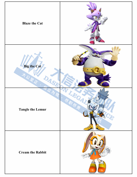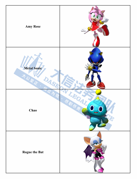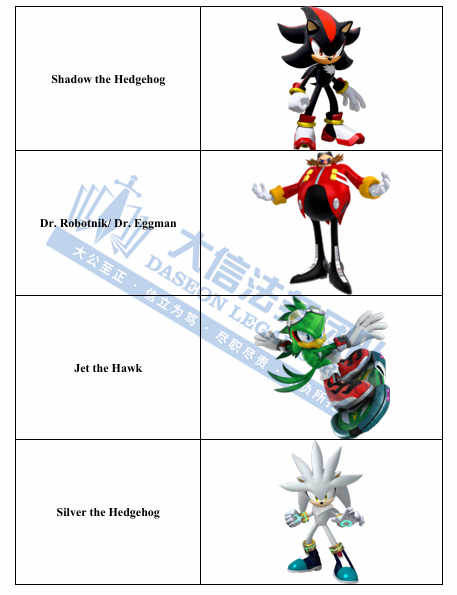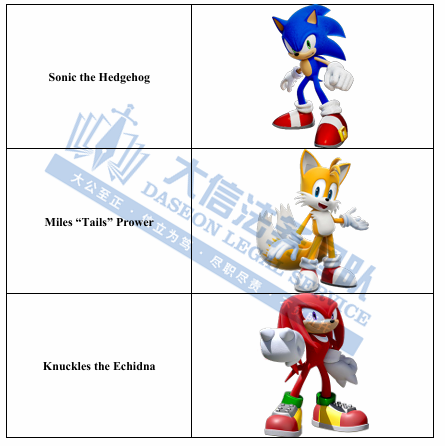 原告Sega Corporation et al 世嘉公司旗下的经典游戏系列主角Sonic the Hedgehog索尼克,索尼克居住在一个充满奇幻色彩的岛屿——翡翠岛,这里生活着各种奇妙的生物。他以其无与伦比的速度和勇敢无畏的精神,不断与邪恶势力——如邪恶的蛋头博士及其机械军团进行斗争,保护岛屿的和平与安宁。作为招牌角色之一,索尼克不仅在游戏界享有盛誉,还成功跨界至动画、漫画及多种商品领域,成为了一个多元化的文化符号。