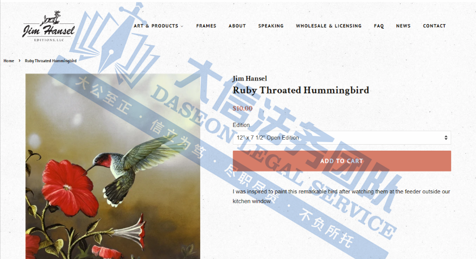 原告是一名美国著名野生动物、自然和风景艺术家,六岁时,他被诊断出患有眼睛部疾病,导致他失明。尽管他的视野有限,但他一直追求他对绘画的热情,并已成为美国和加拿大收藏最多的艺术家之一。作品以其对细节的惊人关注和捕捉自然之美而著称,其代表作品之一是名为“Summer Blooms”的限量版画作,这幅作品是对夏日之美的生动赞美。