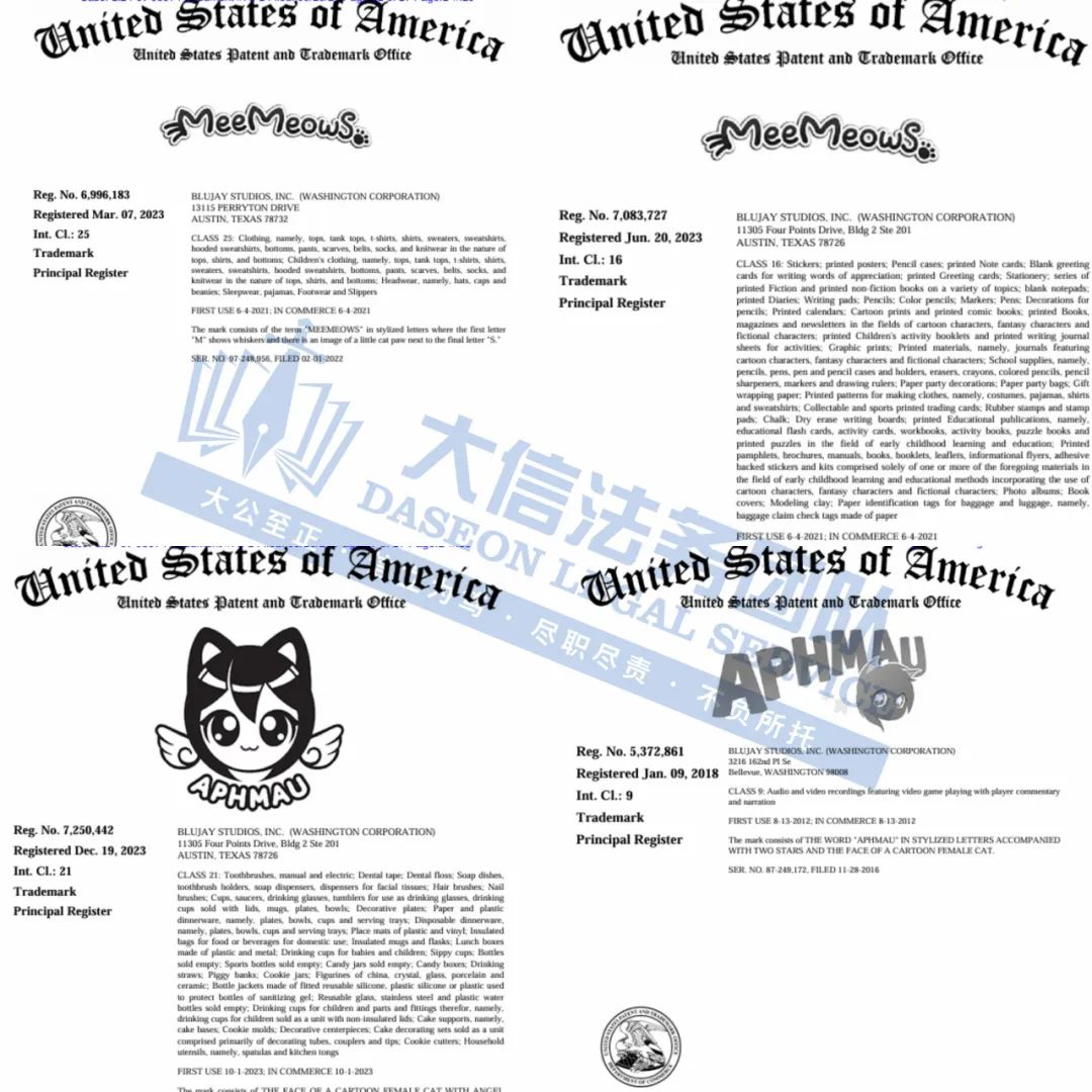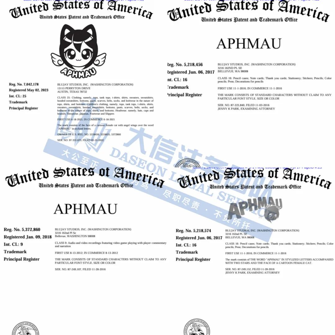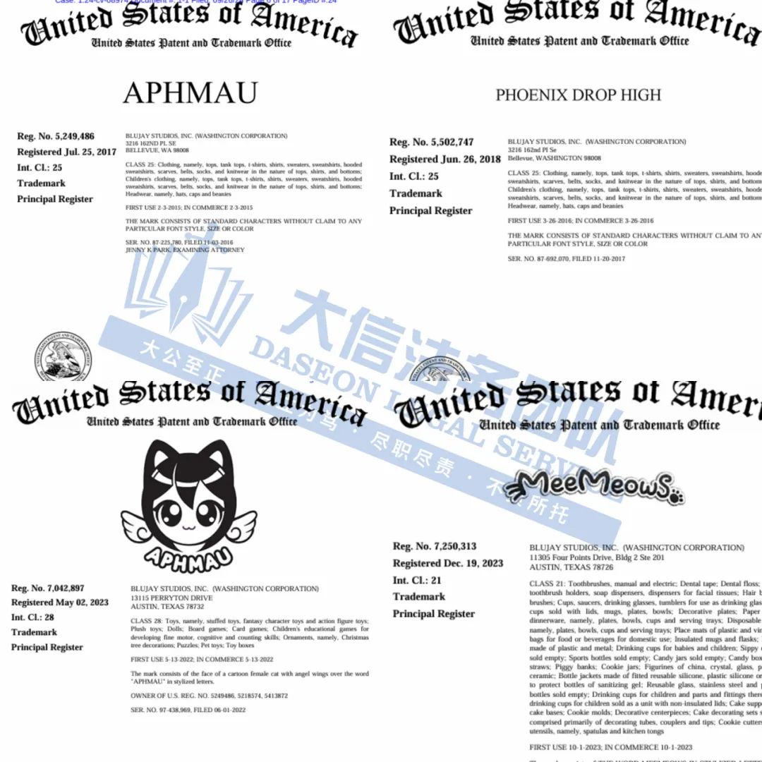 此案为商标维权,原告注册了包含“APHMAU”、“PHOENIX DROP HIGH”、“MEEMEOWS”等商标,除此之外,2024年起至今已委托Keith律所和HSP律所发起了9起商标维权案件,跨境卖家尽快检索下架,避免造成TRO侵权损失!
