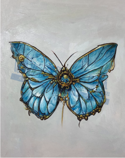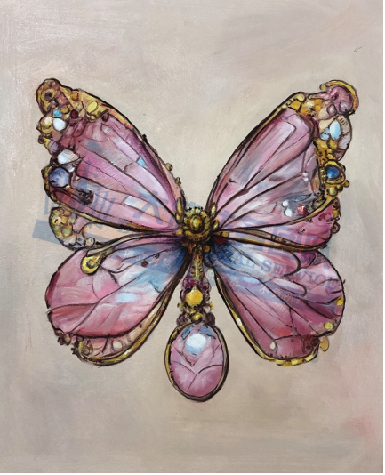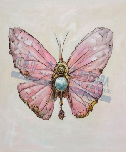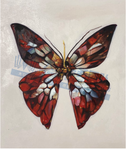 原告是国人油画艺术家,专注于自然与生命主题的创作,其代表作"蝴蝶宝石"系列将昆虫的灵动与矿石的晶莹巧妙结合,以画布为载体,通过精准的色块叠加与光影处理,捕捉蝴蝶羽翼的虹彩渐变,使宝石的璀璨光泽与蝶翅的透明质感在画面中形成视觉对话。蝴蝶宝石这幅作品无论是蝴蝶的身体、翅膀上的图案还是头部的金色装饰品,都尽显精致与细腻。