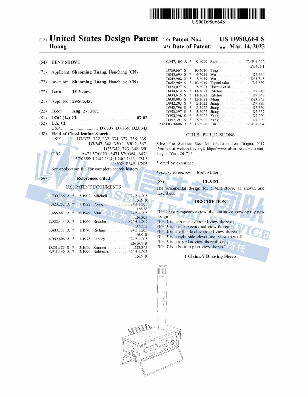 此案为匿名专利维权,此案涉及一项不锈钢多功能帐篷炉外观专利,专利号:US D980664 S,跨境卖家在选品时一定要注意检索,避免造成更大的TRO侵权损失!