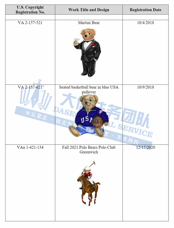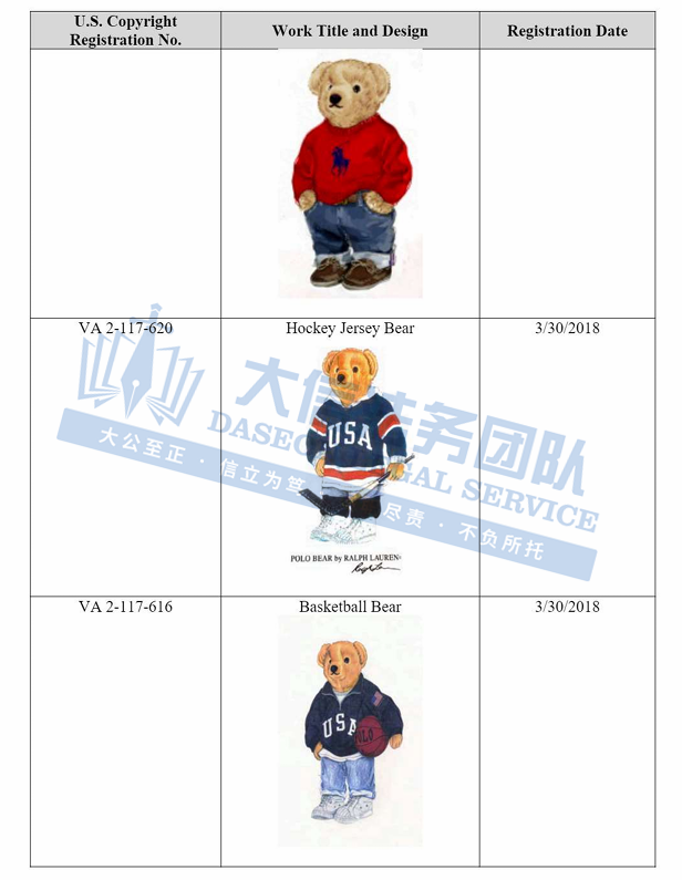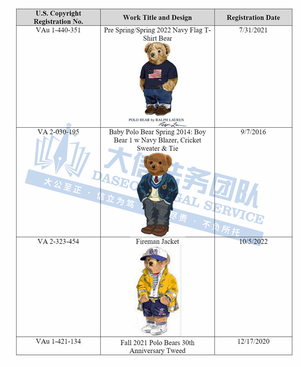 此案为商标+版权维权,主要涉及“RALPH LAUREN”和“POLO”以及多个小熊图案版权维权,以下是具体版权信息,跨境卖家尽快检索下架,避免造成TRO侵权损失!