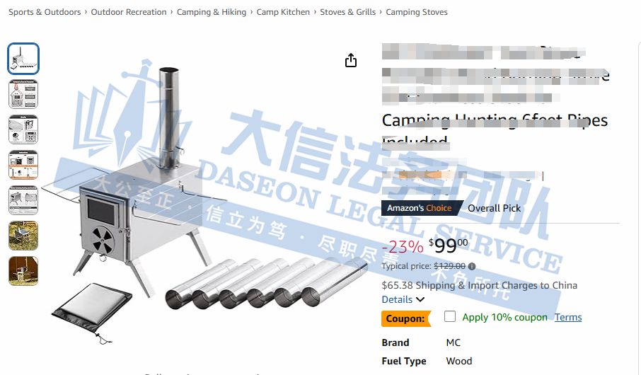 原告是国人卖家,此次维权的是一款帐篷炉的产品,由不锈钢结构制成,不会生锈或腐蚀,非常适合恶劣的户外环境。顶部加热板加热后不会变形,可长期使用。这款燃烧炉可以在小型娱乐空间中加热和烹饪,如帆布墙帐篷、帆布钟形帐篷、圆锥形帐篷、蒙古包、棚子、冰钓小屋、小屋等。