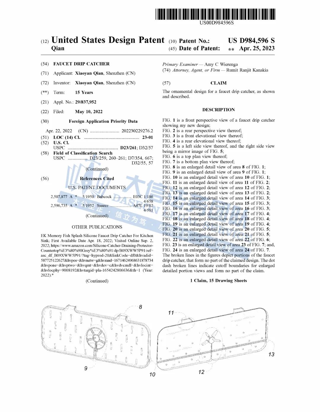 此案为专利维权,涉案产品为一款硅胶排水垫的外观专利,该专利于2023年4月取得专利证书。以下是专利具体信息,跨境卖家尽快检索对照下架,避免造成TRO侵权风险!