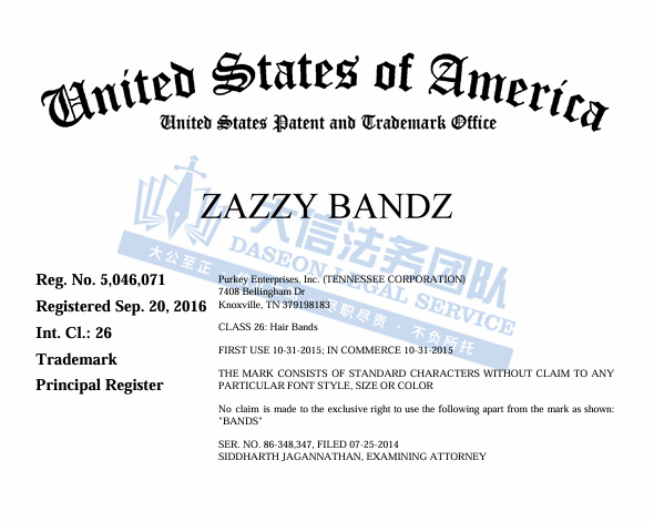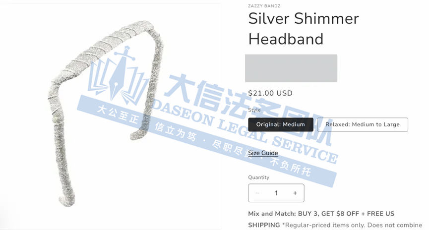 原告是一家美国公司,旗下的Zazzy Bandz是由医学博士 Janet Purkey 设计的,是一款像太阳镜一样的发带。公司致力于为客户提供高品质、时尚且舒适的发带选择,适合各种头发类型和发质。这款发带的特点是其独特的弯曲设计,从而让发带更加贴合头部,避免了传统发带可能带来的不适感。无论是日常生活、运动或者派对活动,都可以可以满足不同人群的需求。