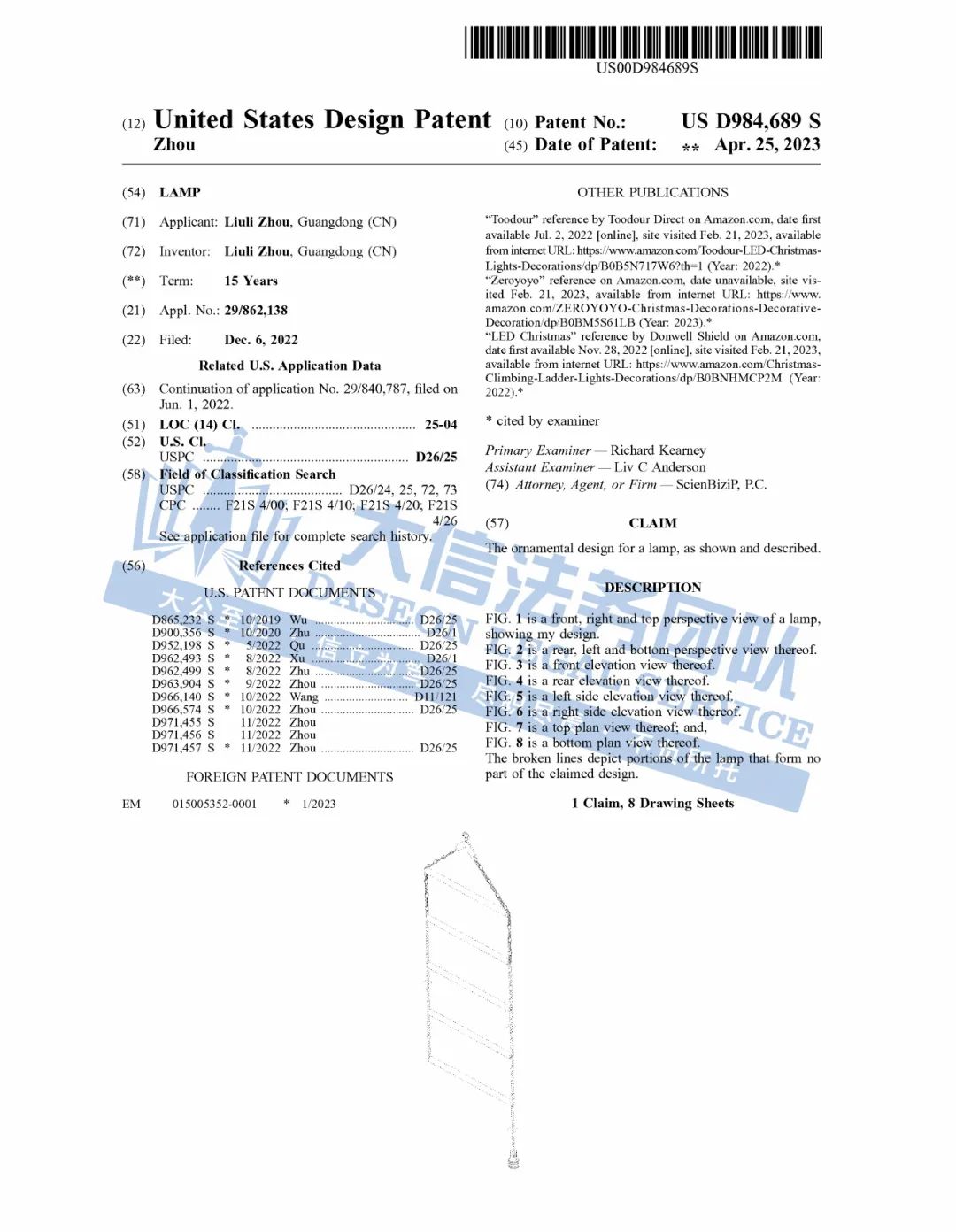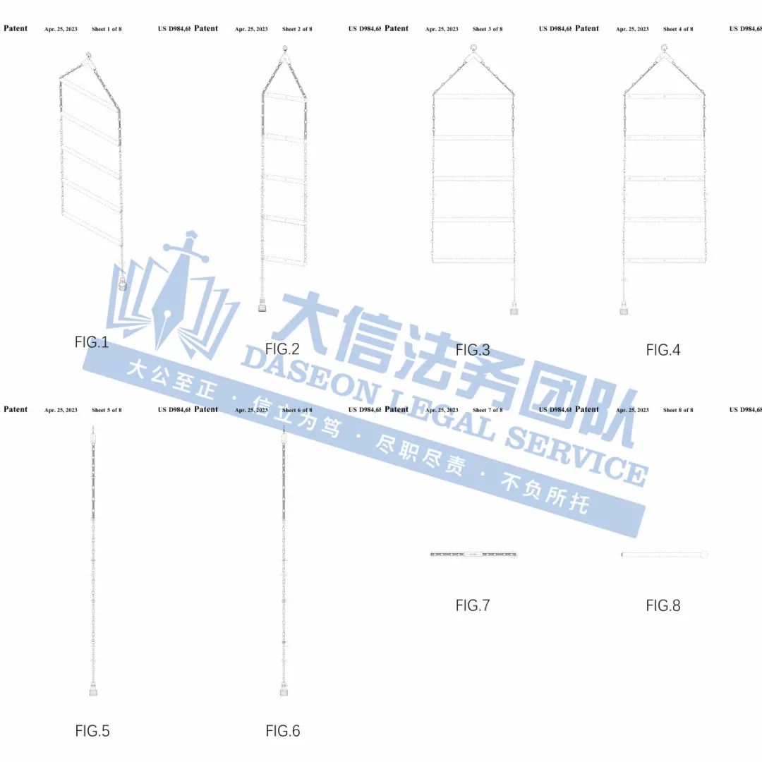 此案为专利维权,原告2023年成功下证了4个关于绳梯LED灯的外观专利,专利号分别为D994165、D984688、D984689、D984690,目前37家店铺涉案,未经授权不得擅自使用,侵权风险极高!跨境卖家尽快检索下架,避免造成TRO侵权损失!