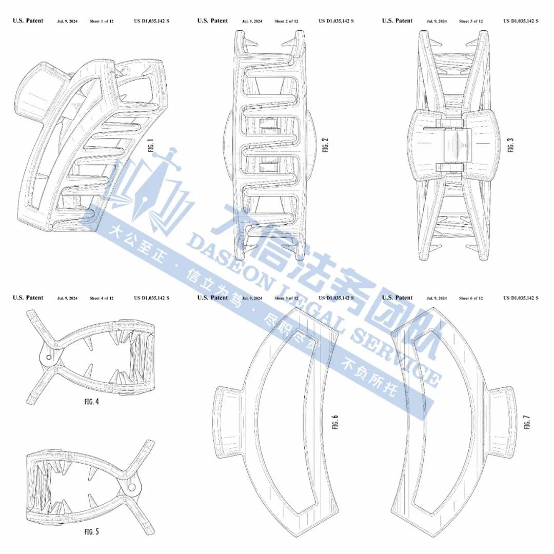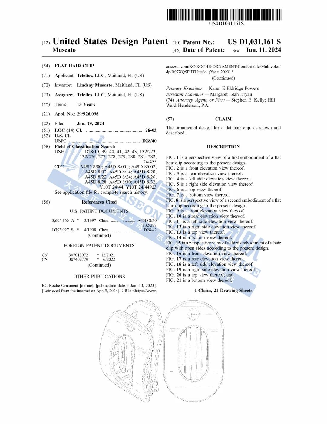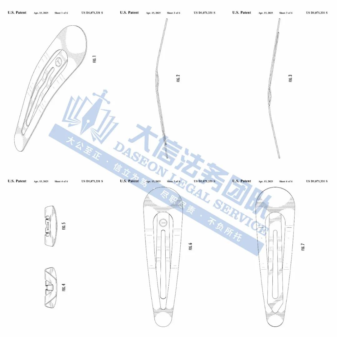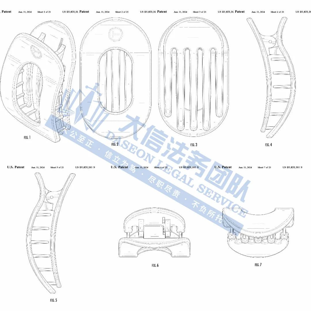 此案为专利维权,涉及一项外观专利,涉案专利号为:D1031161,一款扁平发夹,于2024年6月下证,目前共有18名被告涉案,值得注意,原告旗下共有6项外观专利,以下是专利具体信息,跨境卖家尽快检索下架,避免造成TRO侵权损失!