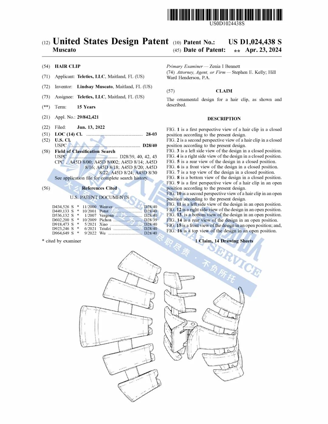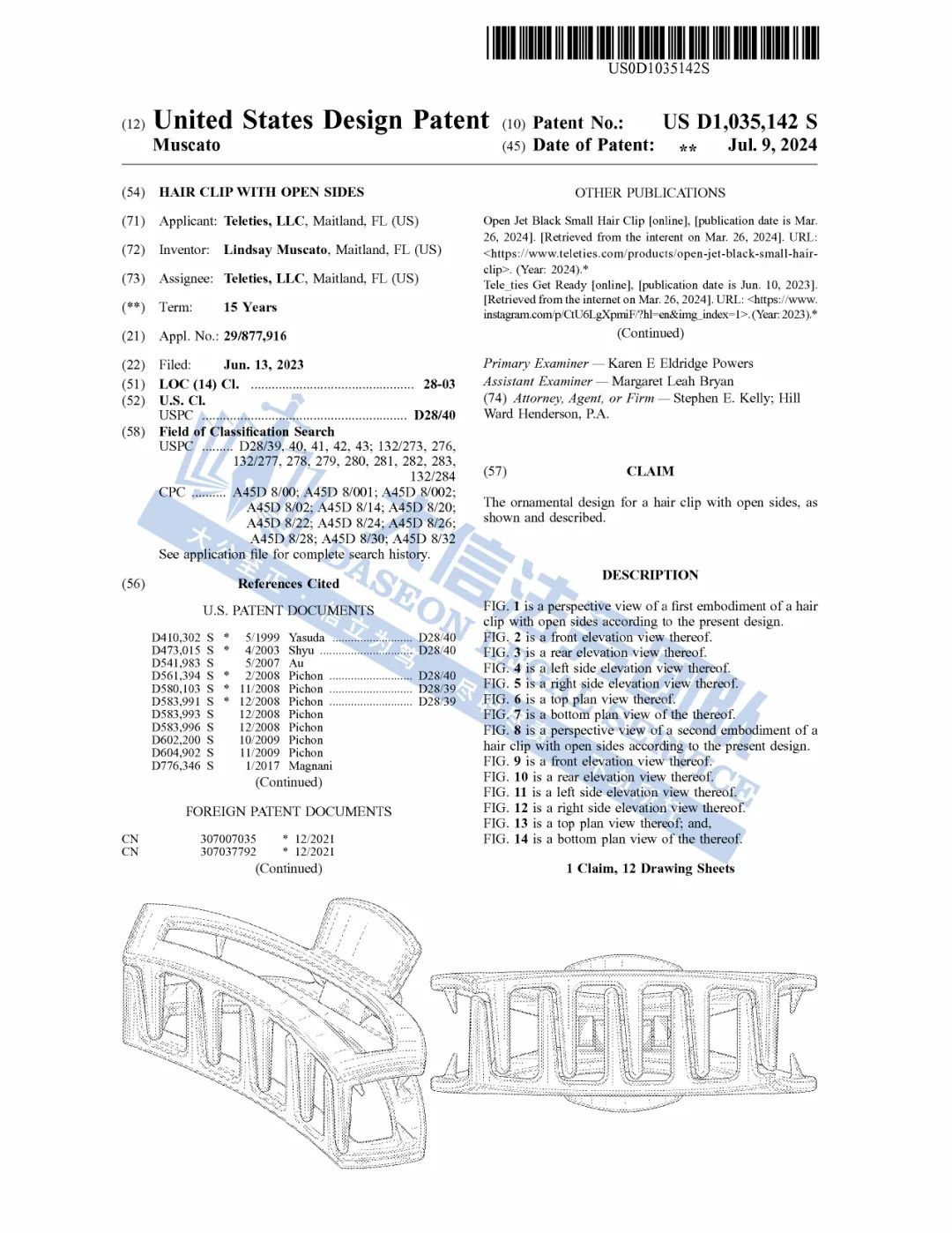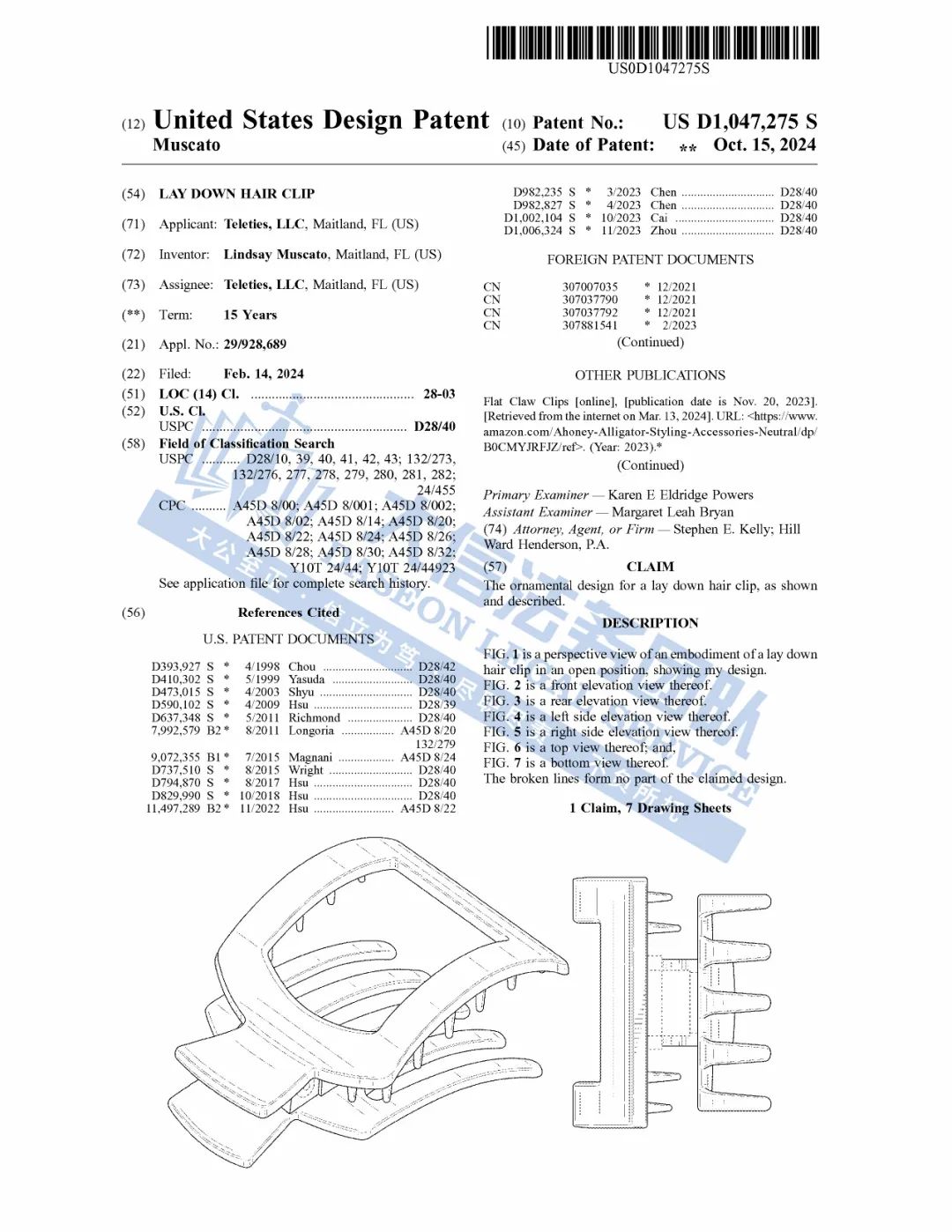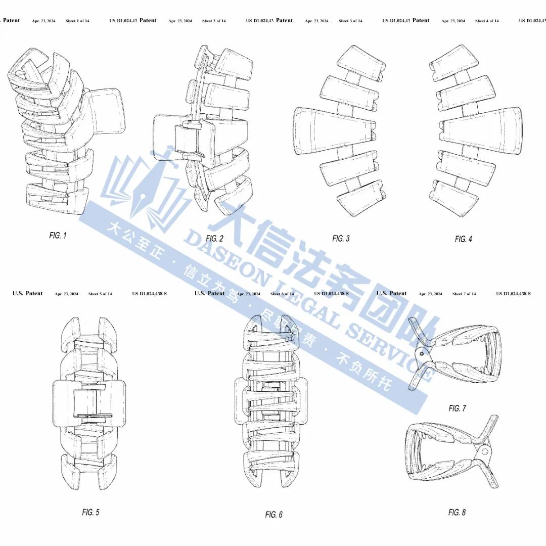 此案为专利维权,涉及一项外观专利,涉案专利号为:D1031161,一款扁平发夹,于2024年6月下证,目前共有18名被告涉案,值得注意,原告旗下共有6项外观专利,以下是专利具体信息,跨境卖家尽快检索下架,避免造成TRO侵权损失!
