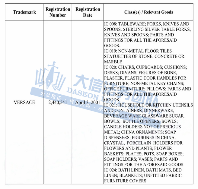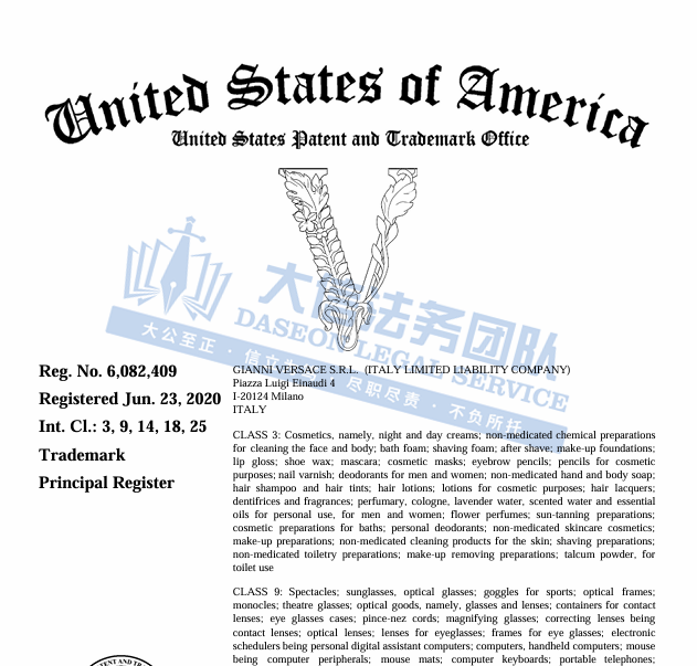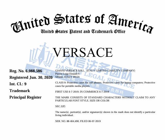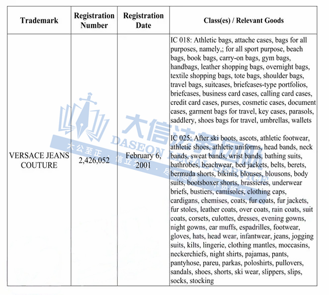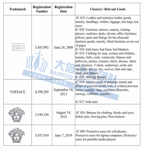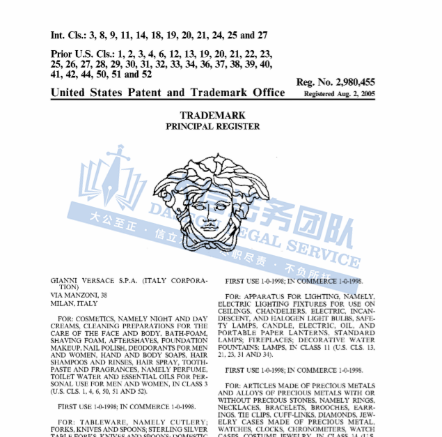 此案为商标维权,商标范围广泛,不仅包含“VERSACE”“VERSACE JEANS COUTURE”等文字商标,还涉及美杜莎头像图形商标,以下是商标的具体信息,跨境卖家尽快检索下架,避免造成TRO侵权损失!