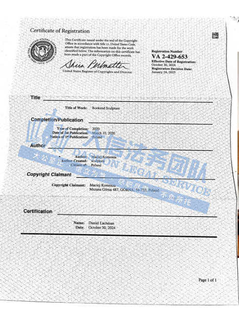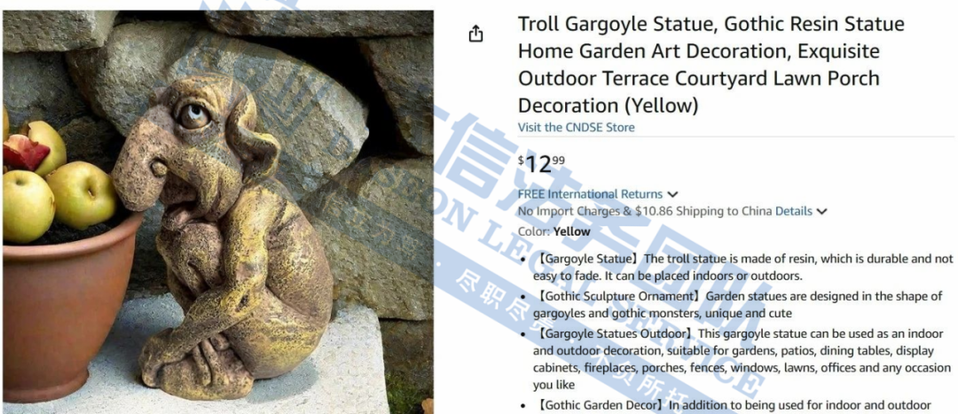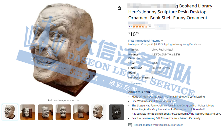 此案为版权维权,涉及一张版权维权,版权号:VA 2-429-653,于24年10月30日下证,目前该案暂未公布版权细节,经查询维权产品为一款Jack Toreenc雕塑,用书于书架上作书挡使用,以下作品可供卖家参考,尽快检索自家产品,避免造成侵权损失!