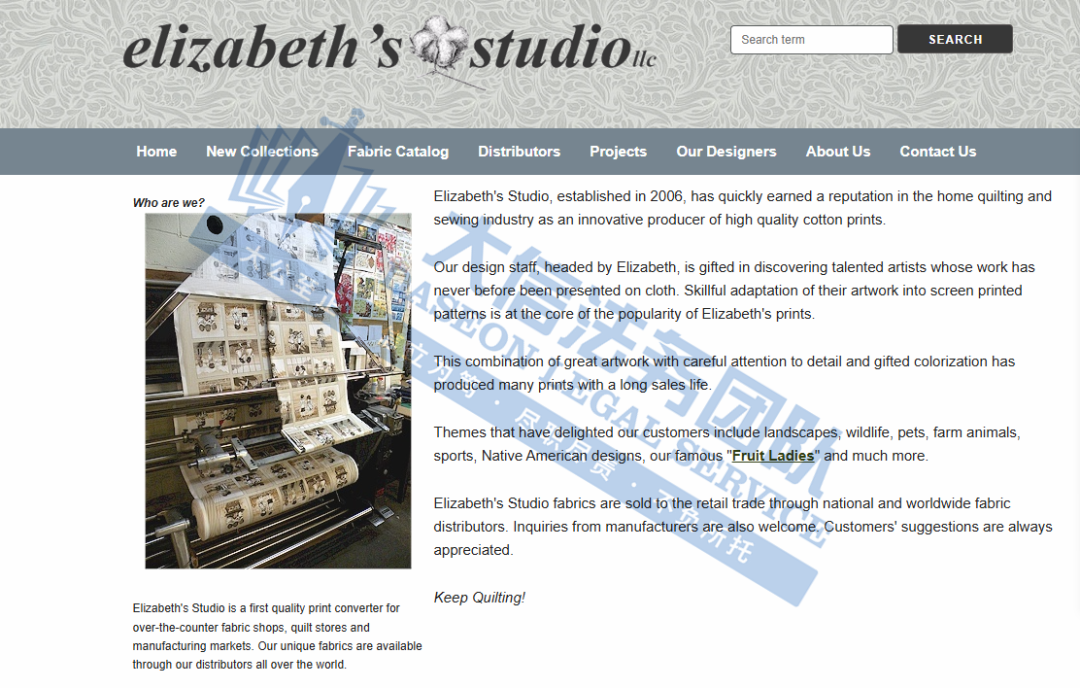 原告 ELIZABETH’S STUDIO LLC 成立于2006年,作为高品质棉布印花的创新生产商,迅速在家庭绗缝和缝纫行业赢得了声誉。设计人员以 Elizabeth 为首,擅长发现才华横溢的艺术家,他们的作品以前从未在布料上展示过。巧妙地将他们的作品改编成丝网印刷图案是 Elizabeth 版画受欢迎的核心。