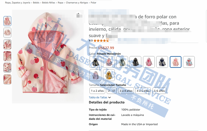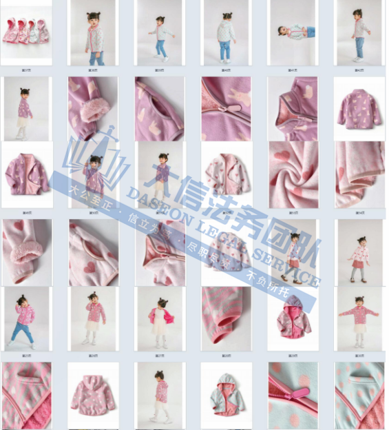 原告是国人卖家,在美国共注册有31个版权作品,涵盖两大核心创作领域:童装设计类:含100多张服饰设计图,涵盖服装款式、面料以及细节特写等;以及模特上身效果展示图,完整覆盖产品呈现的全方位视觉素材。原创插画类:18幅独立创作的插画作品,涉及卡通动物、小碎花、爱心图案以及抽象图案等。