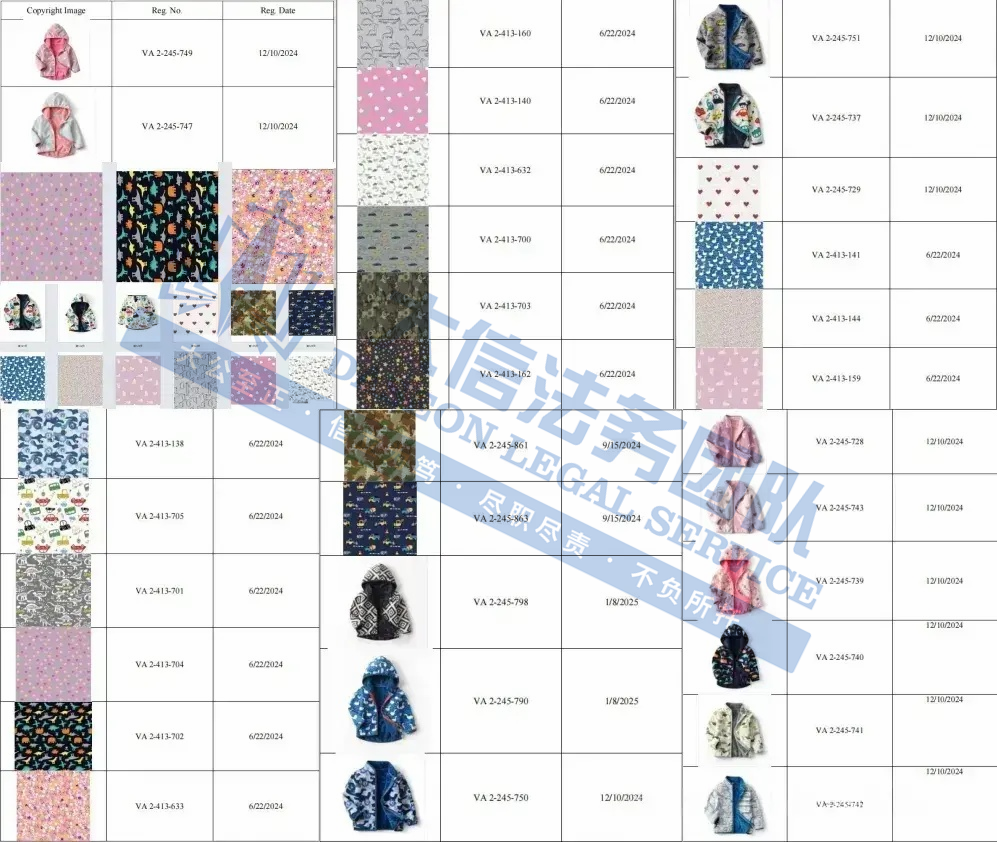 此案为版权维权,涉及10张版权作品,版权号分别为:VA 2-414-472、 VA 2-414-897、 VA 2-414-902、 VA 2-414-475、 VA 2-414-477、 VA 2-414-900、VA 2-414-903、VA 2-414-899、 VA 2-414-474、 和VA 2-414-471,以下是版权具体信息,跨境卖家尽快检索下架,避免造成更大的TRO侵权损失!