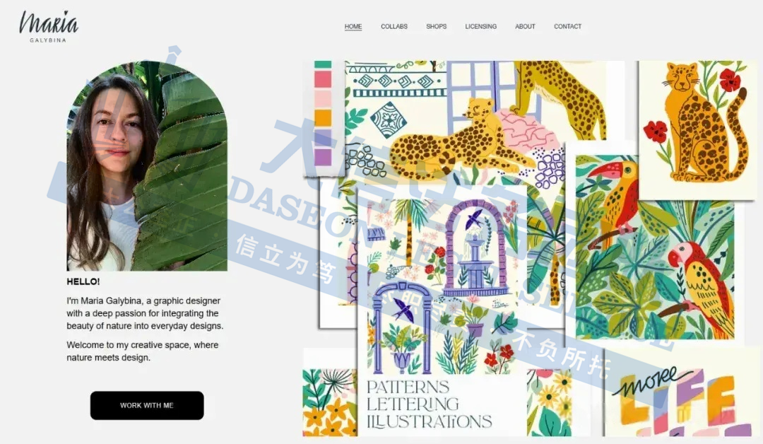原告是是一位来自葡萄牙的专业设计师,同时也是一位插画家,她的作品融合了波西米亚风的随性与浪漫,以自然为主题,充满了对自然美的热爱和追求,她善于运用鲜明的色彩,如《FLOWERING-green》《TROPIC-blue》等作品,色彩主导风格十分突出,作品主题涵盖热带植物、野生动物(如猎豹)、自然景观(如灯塔、波浪)等,展现了大自然的丰富多样,她的作品不仅具有很高的艺术价值,同时也因其独特的风格和丰富的色彩而受到市场的欢迎。