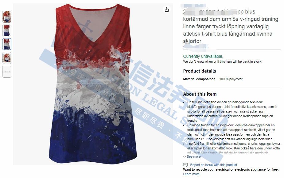 此案为版权维权,涉及一张版权图,是以红白蓝为主色调的抽象画,类似于荷兰国旗,版权号为:VA 2-405-416,以下是具体涉案信息,未经授权不得擅自使用,侵权风险极高!跨境卖家尽快检索下架,避免造成TRO侵权损失!