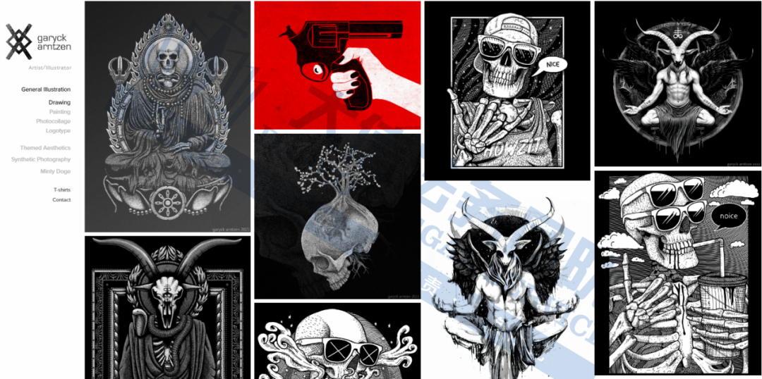 原告是一位独立艺术家和插画师,作品常常以骷髅、佛陀、动物和宇宙符号为元素,呈现出超现实的视觉效果。他的作品探索从宇宙自然到神秘宗教等多样主题,将“Rad Skeletons”(酷骷髅)、“Cosmic Nature”(宇宙自然)和“Spiritual”(精神性)等系列融入作品中,形成了既神秘又富有哲思的视觉体系。作品广泛应用于T恤、金属画、NFT等领域,深受全球粉丝喜爱。