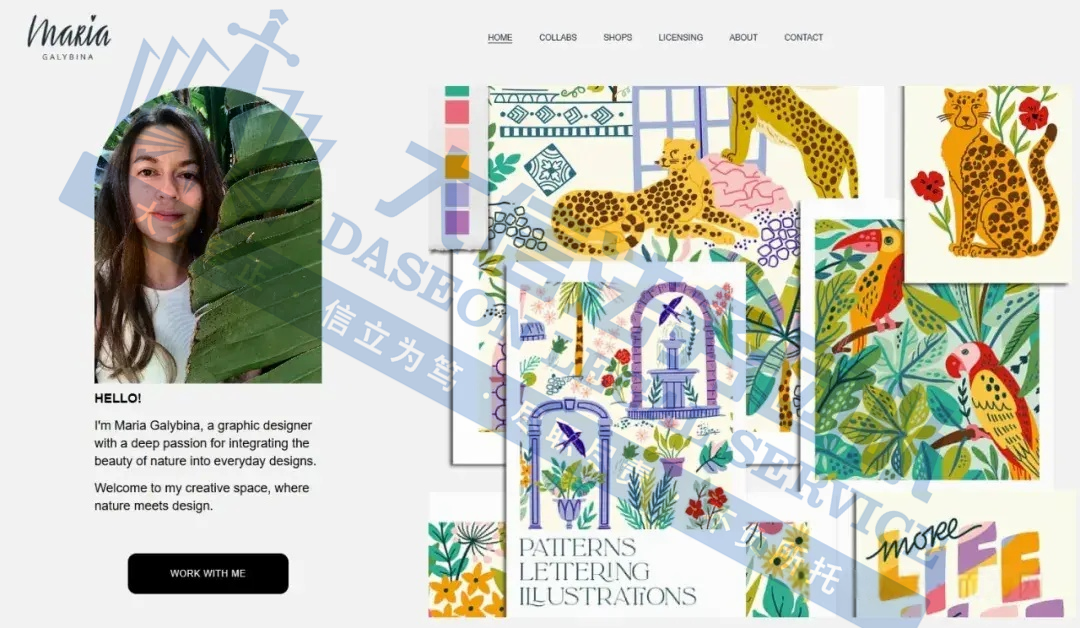 原告是是一位来自葡萄牙的专业设计师,同时也是一位插画家,她的作品融合了波西米亚风的随性与浪漫,以自然为主题,充满了对自然美的热爱和追求,她善于运用鲜明的色彩,如《FLOWERING-green》《TROPIC-blue》等作品,色彩主导风格十分突出,作品主题涵盖热带植物、野生动物(如猎豹)、自然景观(如灯塔、波浪)等,展现了大自然的丰富多样,她的作品不仅具有很高的艺术价值,同时也因其独特的风格和丰富的色彩而受到市场的欢迎。
