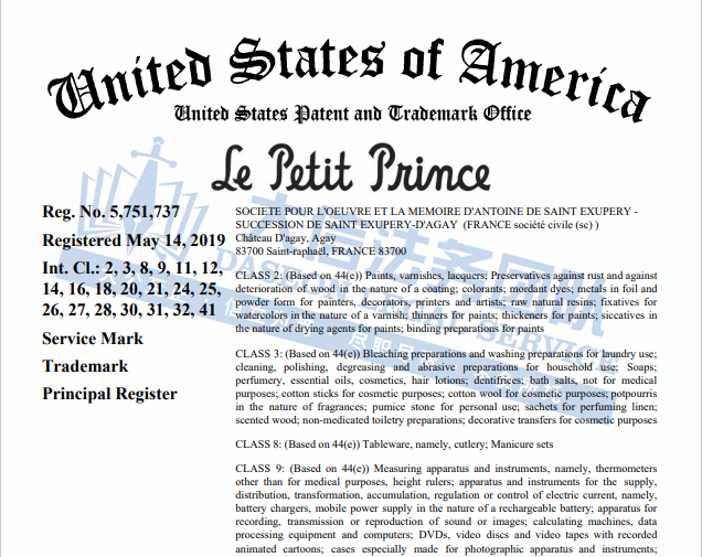 此案为商标维权,涉及商标词:Le Petit Prince、The Petit Prince,除此之外,原告还注册多个图文商标;以下是涉及商标的具体信息,未经授权不得擅自使用,侵权风险极高!跨境卖家尽快检索下架,避免造成TRO侵权损失!