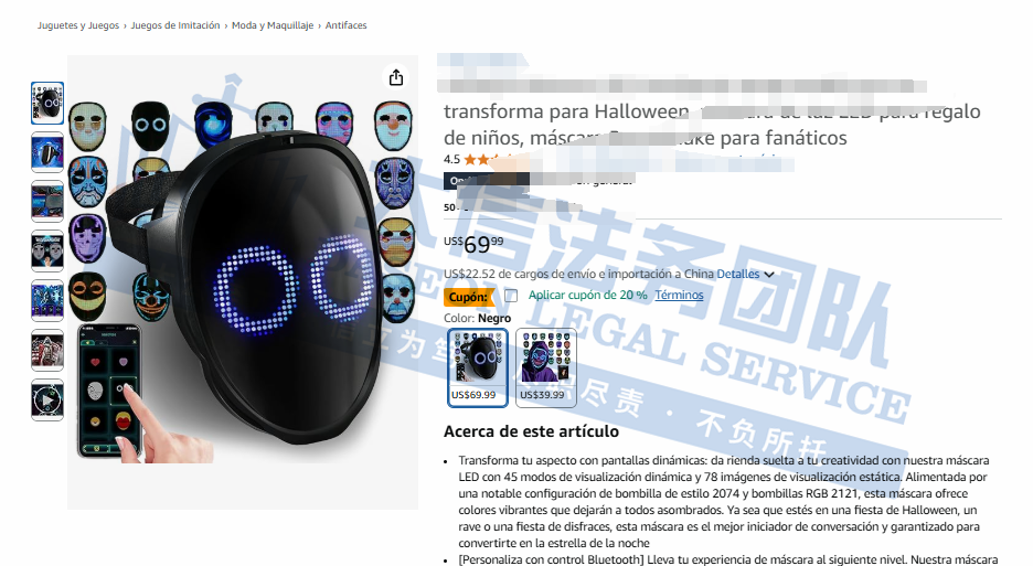 原告是来自深圳的国人卖家,于2016年创立,其明星产品为LED 电子面具。这款面具支持通过手机APP自定义图案、文字、动画,科技感十足,特别适合派对、节庆、舞台演出等场景使用,近年来在欧美市场人气颇高。产品以新奇设计和科技趣味性为核心,广泛应用于派对、节日庆典、娱乐活动及日常消费场景。