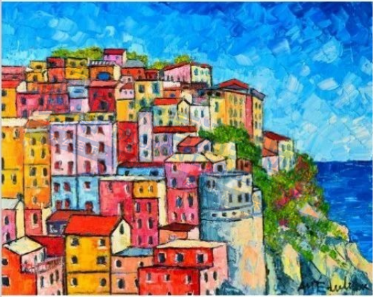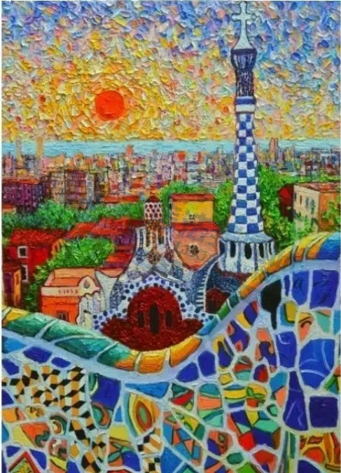 原告是以调色刀厚涂技法创作油画而闻名的全职专业艺术家,她的作品融合了质感印象派与抽象具象主义风格,同时受到表现主义和野兽派的影响。其创作主题丰富多样,涵盖抽象城市景观、花卉、动物、风景、肖像及非客观抽象画等。其中,“抽象城市景观系列”灵感来源于她在欧洲、亚洲、澳大利亚、南美洲和北非的旅行经历,聚焦城市景观与建筑图案。
