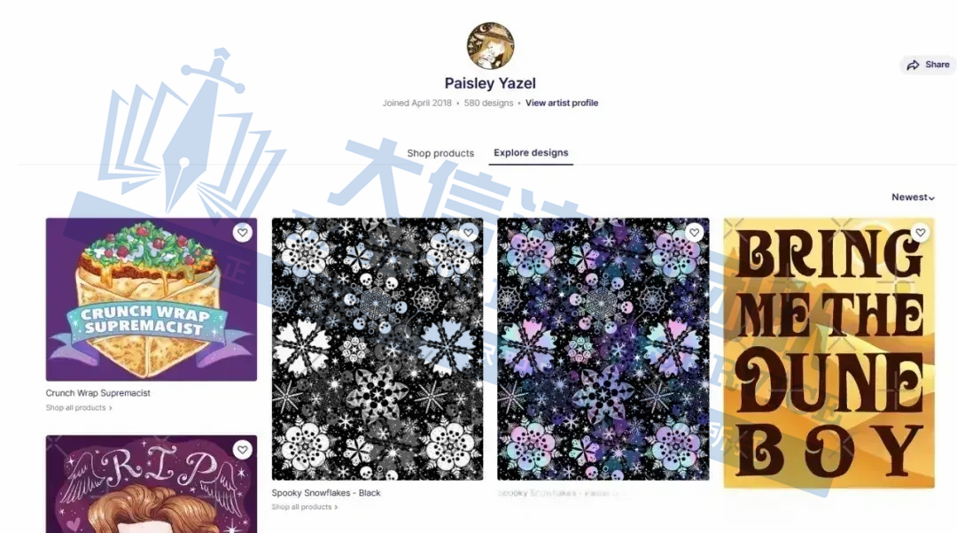 原告Paisley Yazel 是印第安纳州北部活跃的插画家及设计师,也是 Yazel Media LLC 的联合创始人兼核心艺术家,作品以“温馨恐怖”为创作哲学,将宗教符号、鬼屋意象、北美荒野传说与叛逆幽默熔铸成一场视觉悖论,她的创作灵感来源于宗教符号的神秘感、鬼屋的奇幻氛围、西部民间传说的浪漫,北美荒野的原始气息,再综合黑色幽默,形成了其独特的艺术表达。