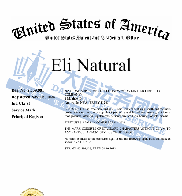 此案为商标维权,涉及一个商标,商标词:Eli Natural,以下是涉及商标的具体信息,未经授权不得擅自使用,侵权风险极高!跨境卖家尽快检索下架,避免造成TRO侵权损失!