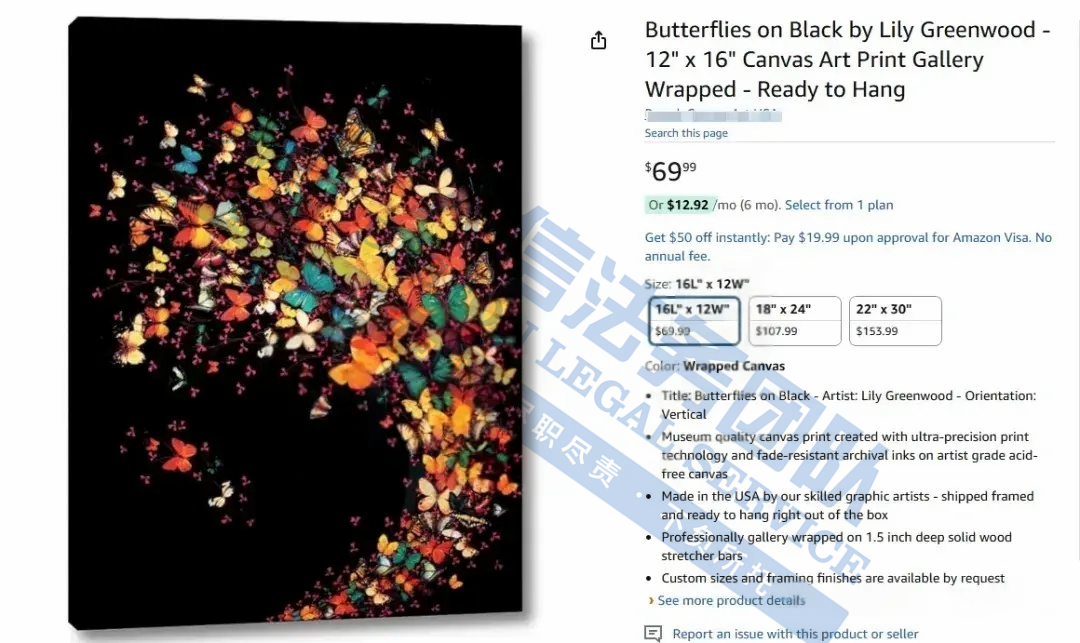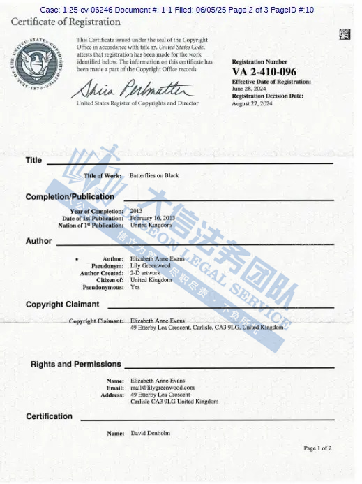 此案为版权维权,涉及一张黑色蝴蝶的版权画,版权号:VA 2-410-096,于2024年6月下证,值得注意的是,原告在美国注册了28项蝴蝶版权,未经授权不得擅自使用,侵权风险极高!跨境卖家尽快检索下架,避免造成TRO侵权损失!