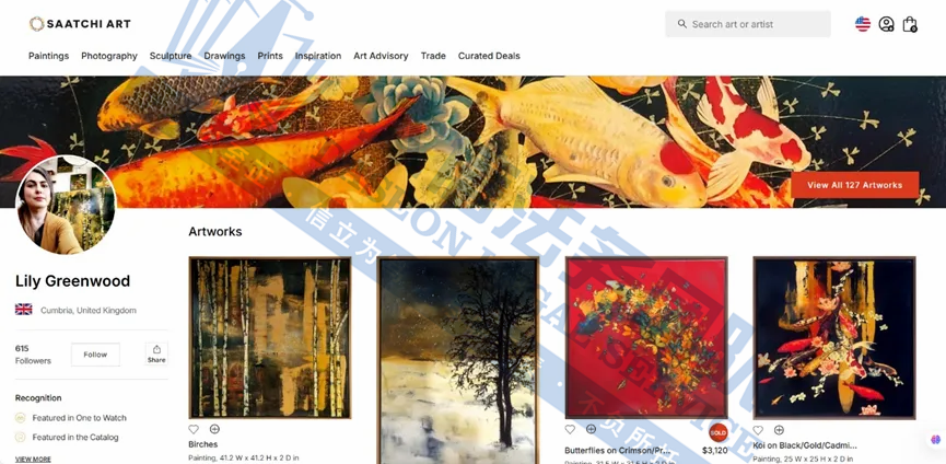 原告是英国女画家以其融合东方美学的自然主题绘画而备受赞誉。作品受到十八世纪日本版画家北斋和广重的影响,以自然元素为主题,同时结合了日本和服设计的元素,她的画风融合了东方韵味。通过色彩、光影、对称与不对称的平衡,创造独特的视觉美学,受到了广泛的关注!