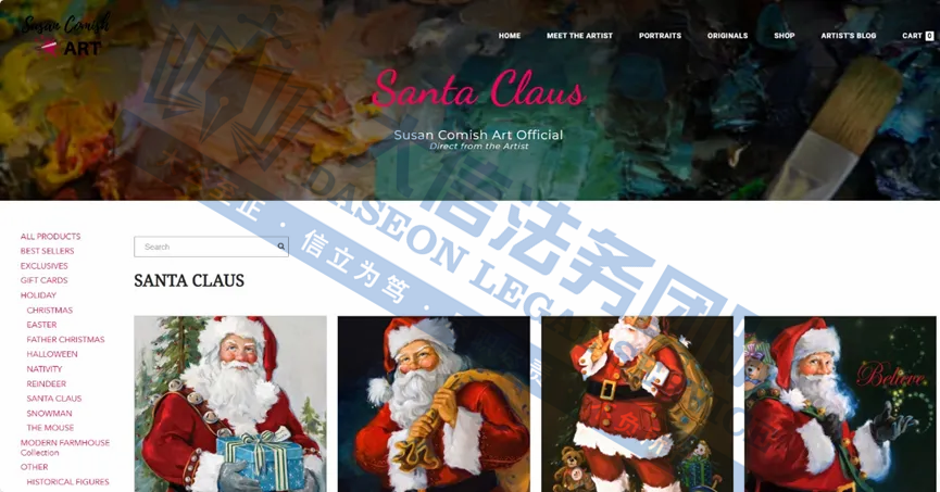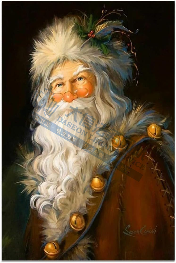 原告是一位以圣诞主题版画及圣诞老人肖像画闻名的艺术家,她的作品以温馨、梦幻的绘画风格而闻名,尤其擅长描绘圣诞主题、天使、儿童与家庭温情场景。她的画作色彩柔和、情感真挚,常常带有宗教或节日氛围,深受家庭装饰品市场的欢迎。她的作品被广泛应用于版画、包装盒、拼图、旗帜、卡片等各类节日商品,其作品覆盖全球,被多国大学、机构及私人收藏。