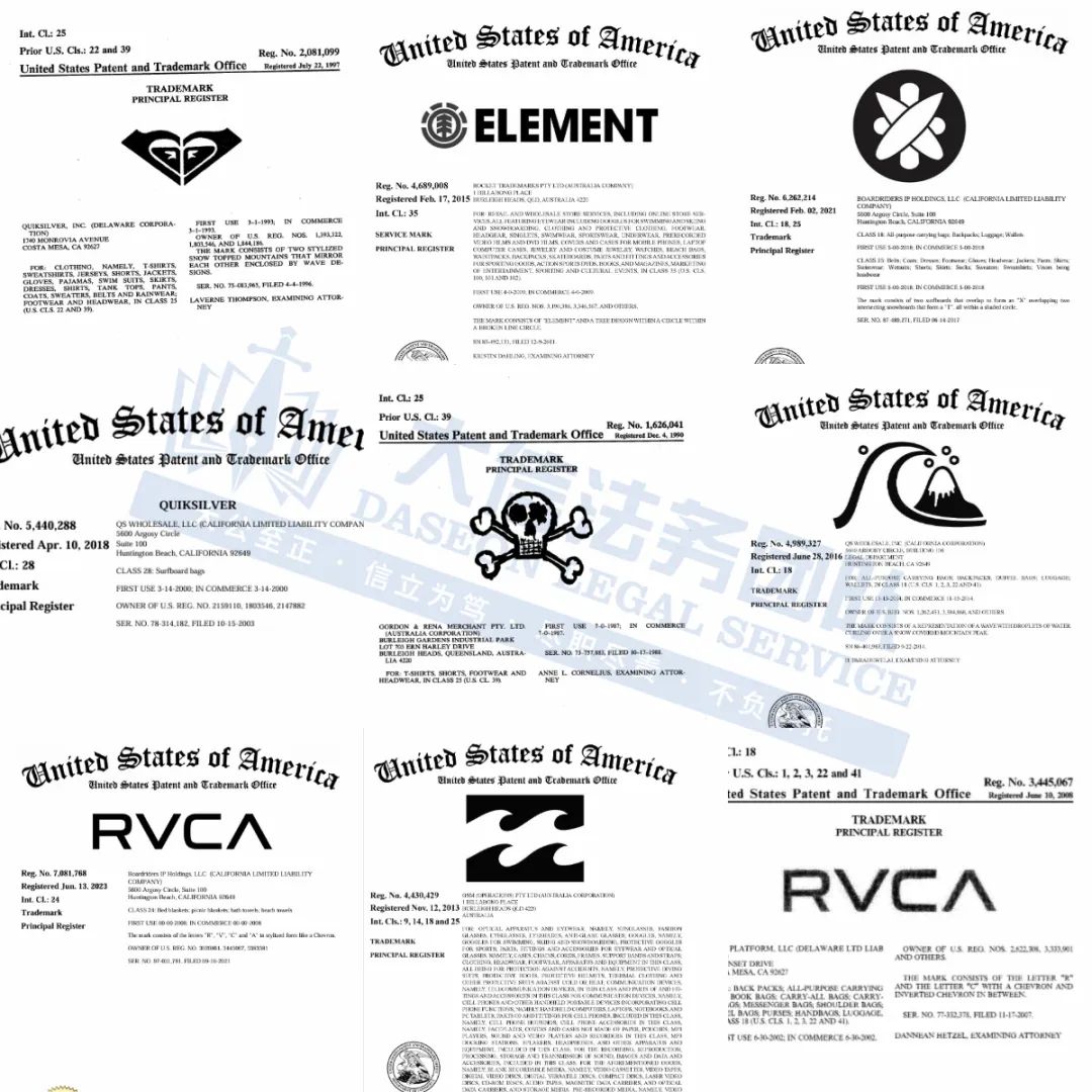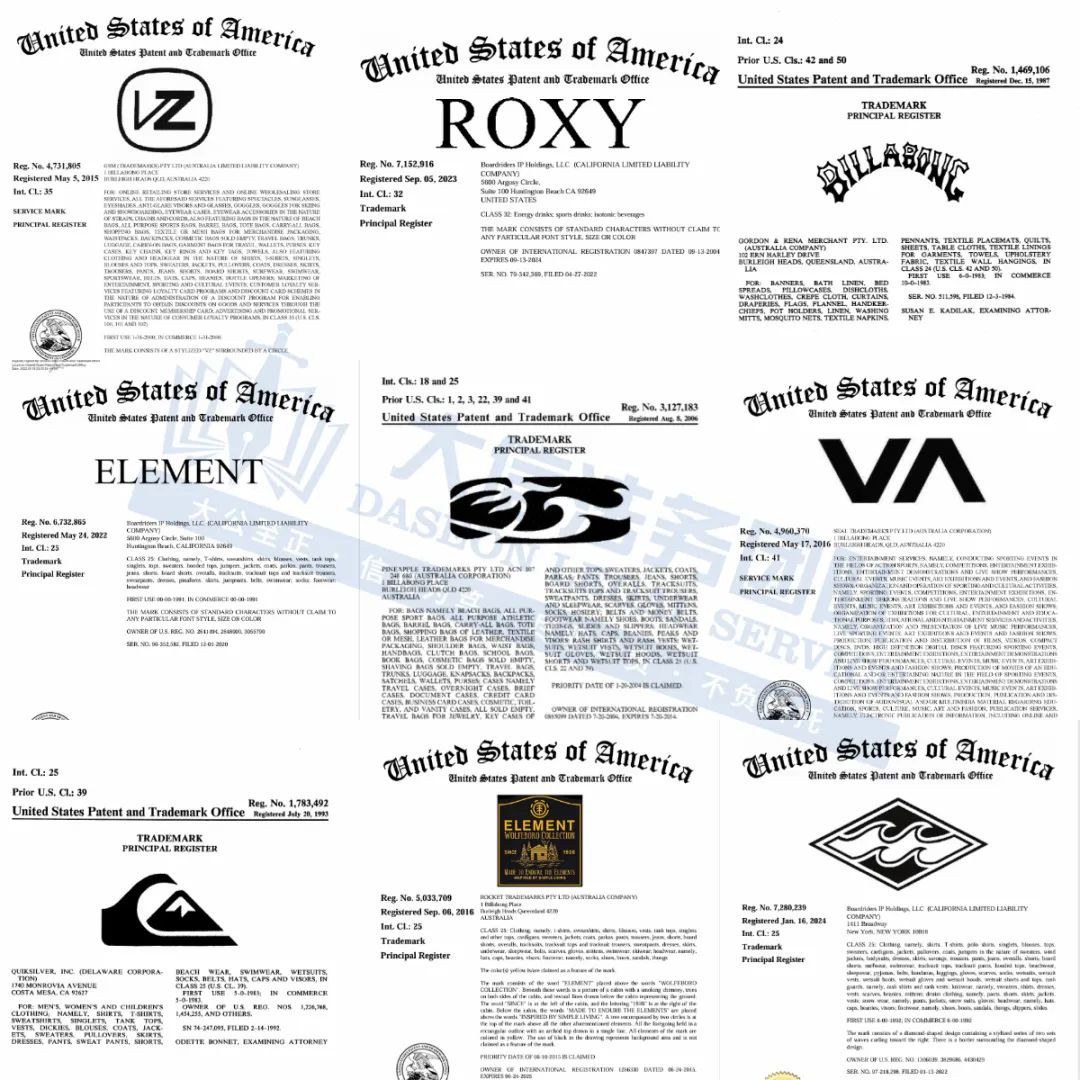 此案为商标维权,目前已有349家店铺被冻结,主要针对原告旗下130多个商标维权,关键词:ELEMENT、BILLABONG、BOARDRIDERS、VZ 等,以下是涉及商标具体信息,未经授权不得擅自使用,侵权风险极高!跨境卖家尽快检索下架,避免造成TRO侵权损失!