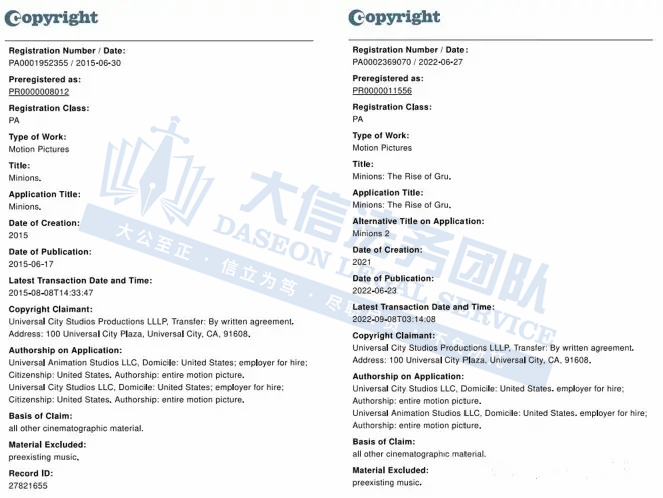 原告环球影视(Universal Pictures)是美国知名电影制片与发行公司,旗下拥有《神偷奶爸》《速度与激情》《大白鲨》和《外星人E.T.》等经典电影系列,The Despicable Me小黄人系列主要讲述了三个呆萌小黄人误打误撞成为反派部下,为偷王冠掀起爆笑冒险,萌翻全球的故事。The Fast & Furious 速度与激情系列主要讲述了飞车家族为救亲人再度出山,与神秘对手在世界各地展开生死飙车对决,燃爆肾上腺素的故事。Jaws大白鲨主要讲述了海滨小镇频发鲨鱼袭人事件,警察、科学家与捕鲨高手联手猎杀巨鲨,掀起惊悚狂潮的故事。E.T. the Extra-Terrestrial E.T.外星人则讲述了一个小男孩与外星人建立奇妙友谊,携手躲避政府追捕,上演温情科幻传奇,感动跨越星际的故事。