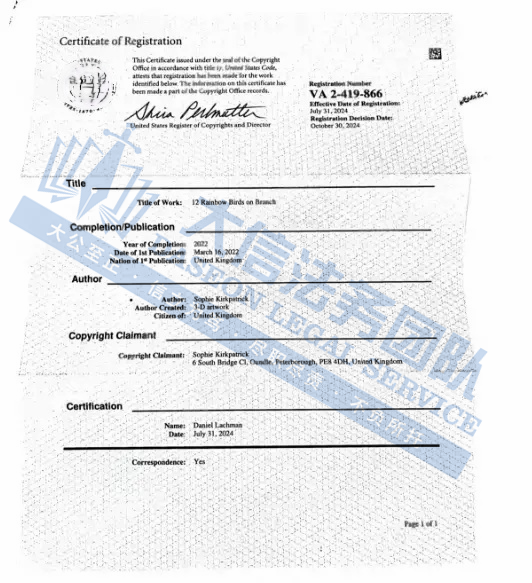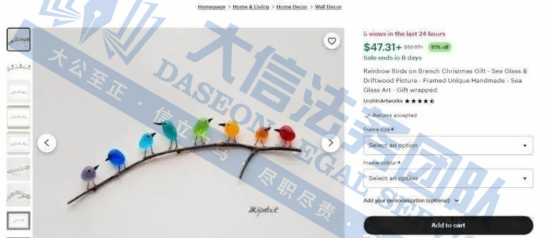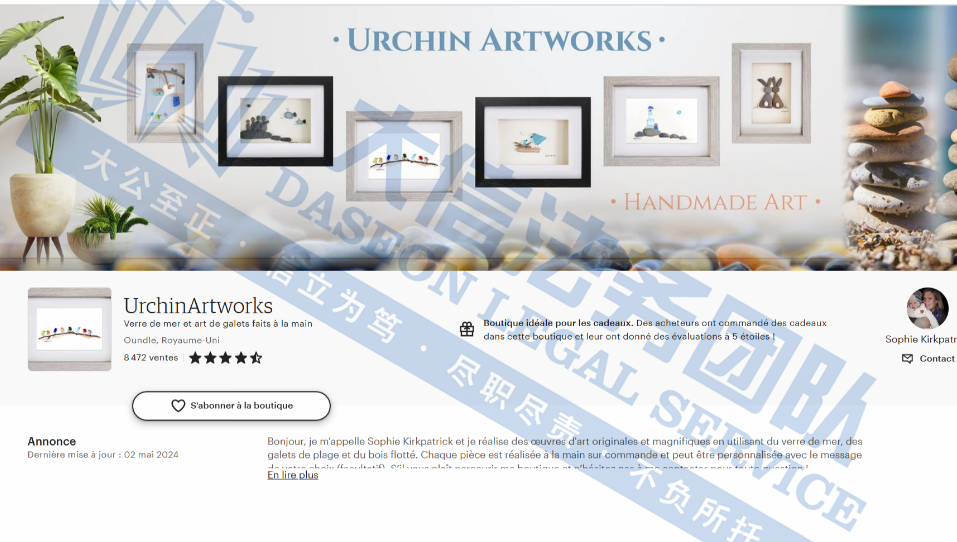 原告是一位英国艺术家,她的作品展现了对自然美的敏锐捕捉,也传递了她对生活的热爱与感悟,其作品常以海玻璃、鹅卵石和浮木等自然材料为特色,这些材料的使用不仅体现了环保理念,还赋予了作品独特的质感和美感,她的作品主题丰富多样,如“彩虹鸟在树枝上”等,展现了她对自然的热爱和敏锐的艺术感知力,其作品被广泛应用于装饰画、家居装饰等领域,深受消费者喜爱。