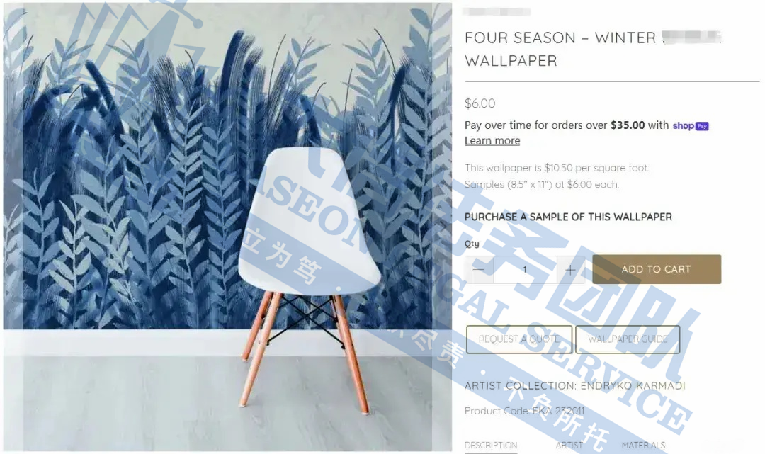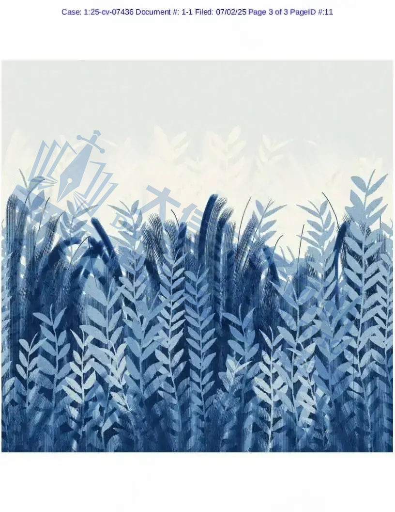 此案为版权维权,涉及一张《Four Season - Winter Breeze》版权画,版权号为 VA2-420-714,除此之外,官网的其他作品,未经授权,均不可擅自使用,侵权风险极高,跨境卖家尽快检索下架,避免造成TRO侵权损失!