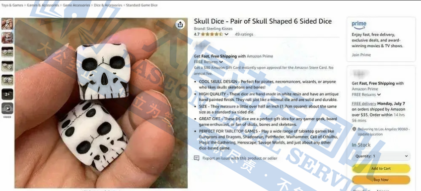 原告是一位珠宝设计师,并创立了SterlingKisse独立插画品牌,作品风格融合哥特美学与奇幻视觉,涵盖插画、饰品、印花商品等多个类别。骷髅骰子设计融合了暗黑美学与实用主义风格。该设计将哥特式阴森意象与日常器物巧妙结合,通过银饰雕刻、复古金属工艺等手法,使骷髅骰子兼具艺术与功能属性,是 Etsy、Shopify 等平台上的热销品之一,在收藏和桌游爱好者中拥有较高辨识度。