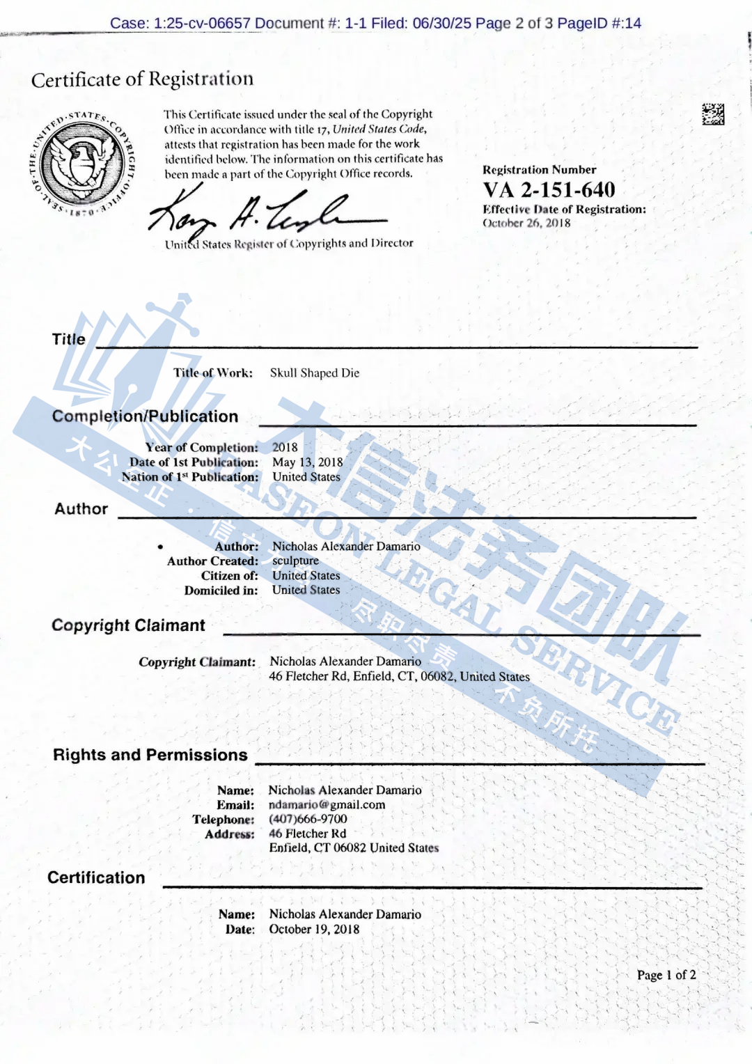 此案为版权维权,涉及1张版权图,版权号:VA 2-151-640,于2018年8月下证,除此之外,官网的其他作品,未经授权,均不可擅自使用,侵权风险极高,跨境卖家尽快检索下架,避免造成TRO侵权损失!